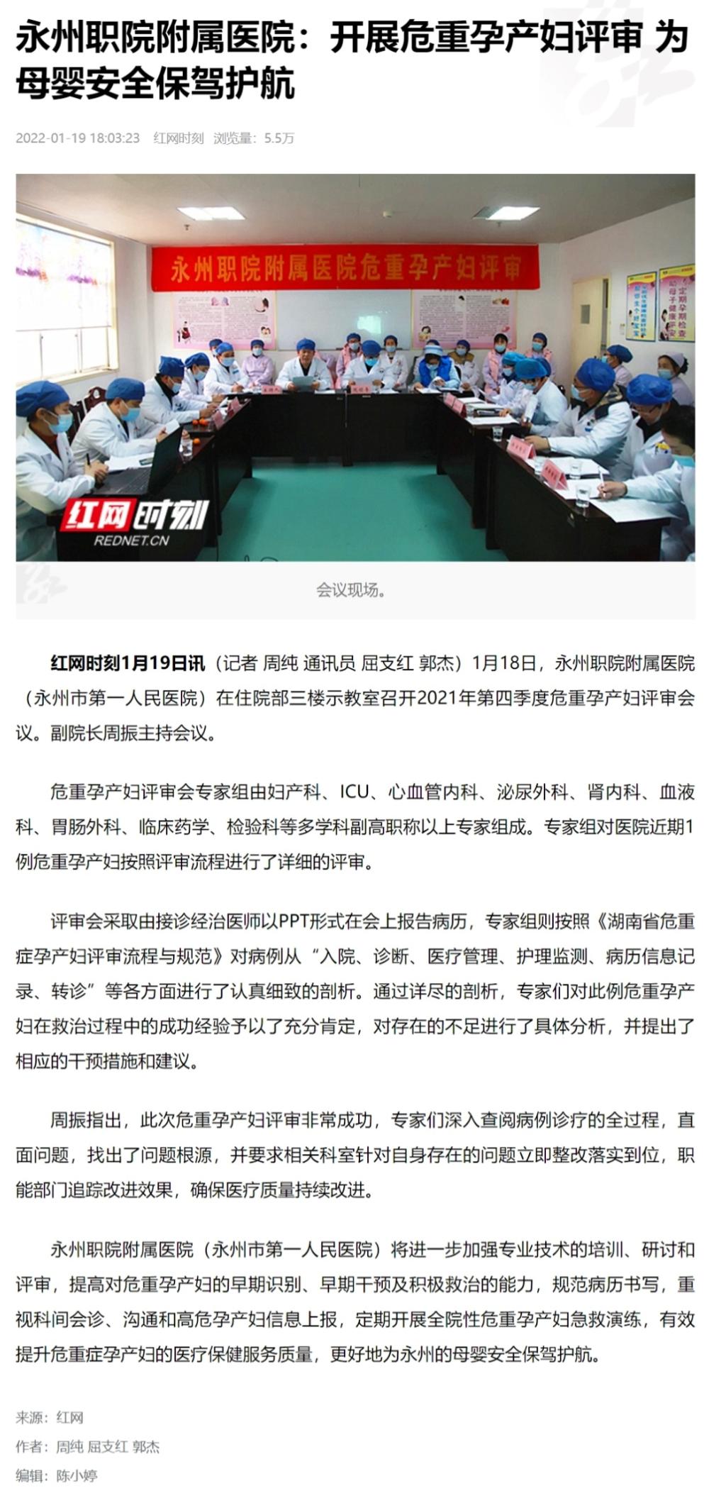 永州职院附属医院(永州市第一人民医院)将进一步加强专业技术的培训、研讨和评审,提高对危重孕产妇的早期识别、早期干预及积极救治的能力,规范病历书写,重视科间会诊、沟通和高危孕产妇信息上报,定期开展全院性危重孕产妇急救演练,有效提升危重症孕产妇的医疗保健服务质量,更好地为永州的母婴安全保驾护航。