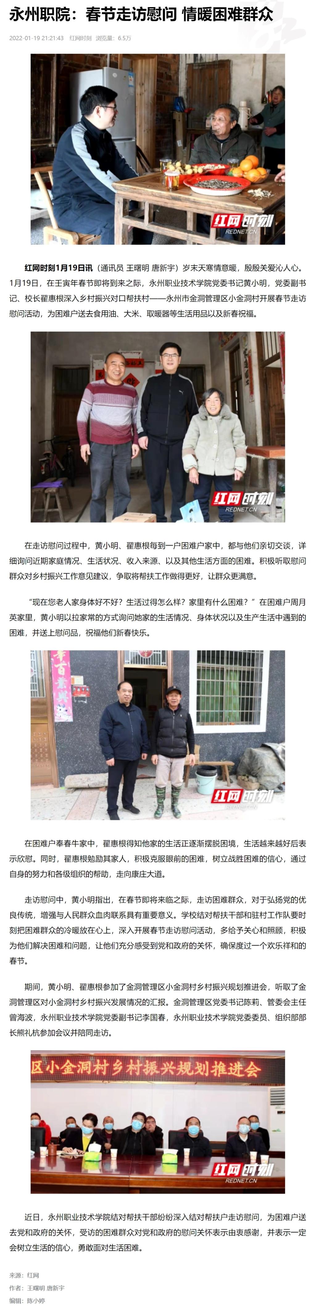 近日,永州职业技术学院结对帮扶干部纷纷深入结对帮扶户走访慰问,为困难户送去党和政府的关怀,受访的困难群众对党和政府的慰问关怀表示由衷感谢,并表示一定会树立生活的信心,勇敢面对生活困难。