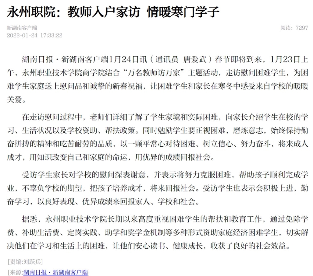 湖南日报·新湖南客户端1月24日讯(通讯员 唐爱武)春节即将到来,1月23日上午,永州职业技术学院商学院结合“万名教师访万家”主题活动,走访慰问困难学生,为困难学生家庭送上慰问品和诚挚的新春祝福,让困难学生和家长在寒冬中感受来自学校的暖暖关爱。