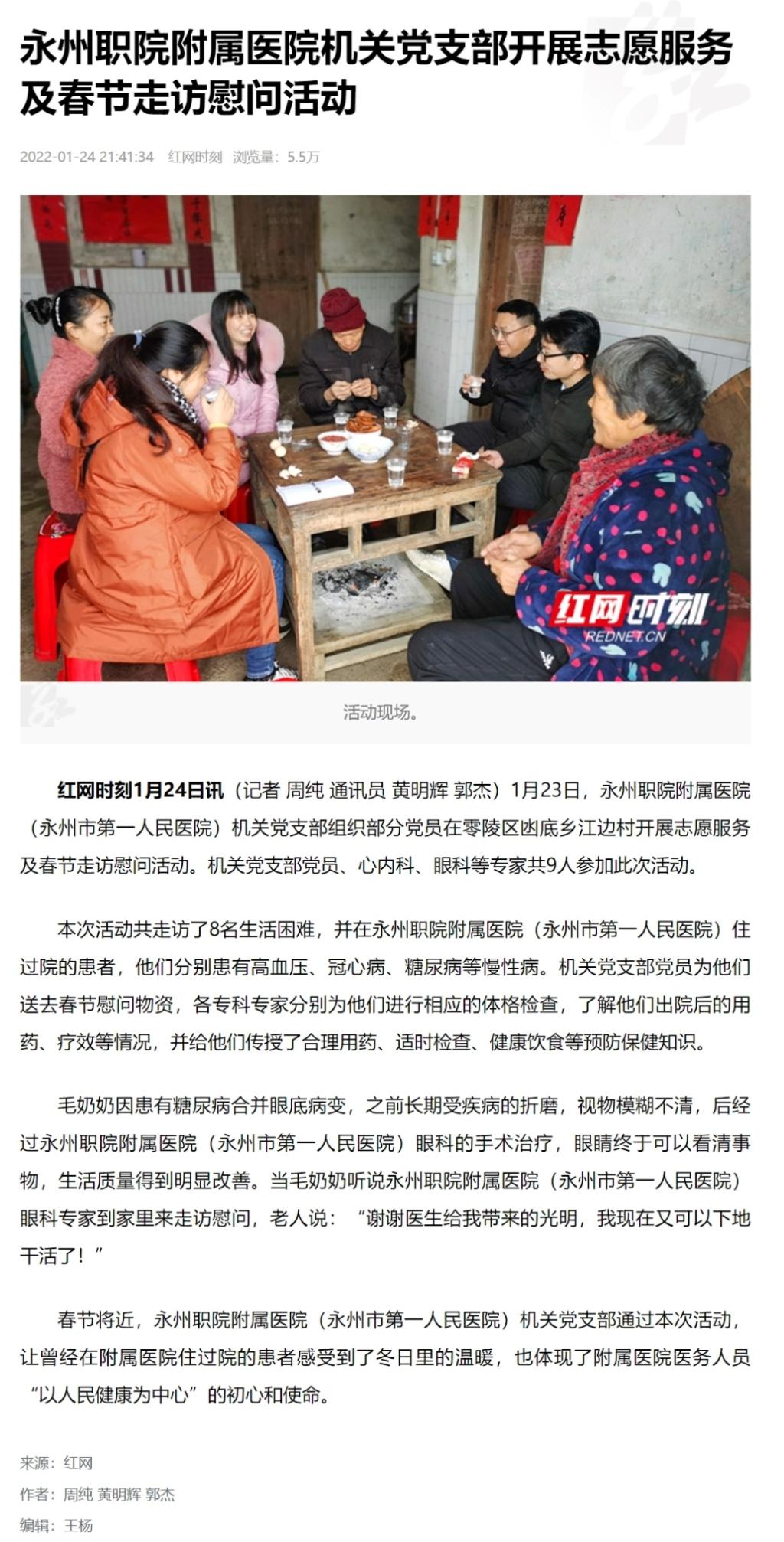 红网时刻1月24日讯(记者 周纯 通讯员 黄明辉 郭杰)1月23日,永州职院附属医院(永州市第一人民医院)机关党支部组织部分党员在零陵区凼底乡江边村开展志愿服务及春节走访慰问活动。机关党支部党员、心内科、眼科等专家共9人参加此次活动。