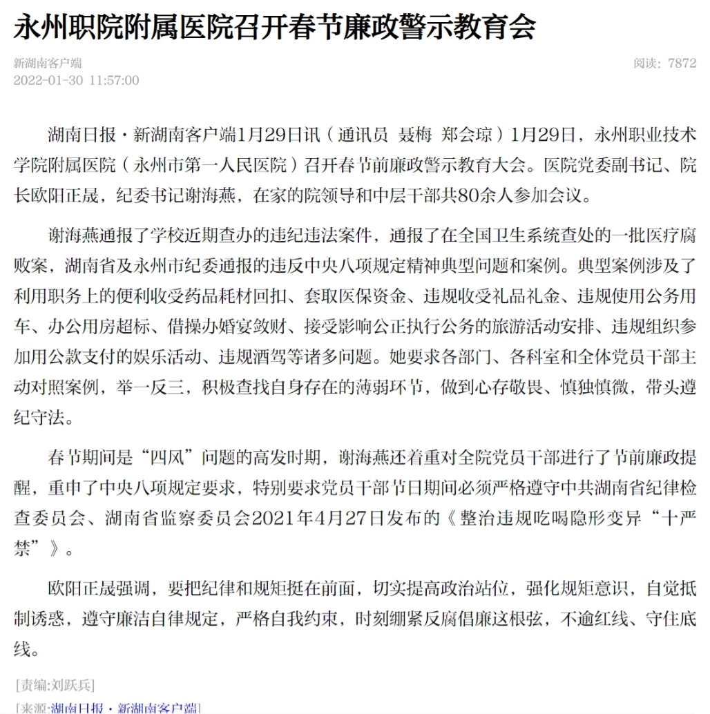 湖南日报·新湖南客户端1月29日讯(通讯员 聂梅 郑会琼)1月29日,永州职业技术学院附属医院(永州市第一人民医院)召开春节前廉政警示教育大会。医院党委副书记、院长欧阳正晟,纪委书记谢海燕,在家的院领导和中层干部共80余人参加会议。