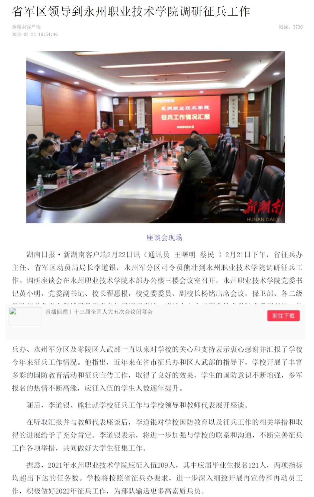 湖南日报·新湖南客户端2月22日讯(通讯员 王曙明 蔡民 )2月21日下午,省征兵办主任、省军区动员局局长李道银,永州军分区司令员熊壮到永州职业技术学院调研征兵工作。调研座谈会在永州职业技术学院本部办公楼三楼会议室召开,永州职业技术学院党委书记黄小明,党委副书记、校长翟惠根,校党委委员、副校长杨铭出席会议,保卫部、各二级学院相关负责人和辅导员代表参加了调研座谈。座谈会由永州职业技术学院党委副书记、校长翟惠根主持。