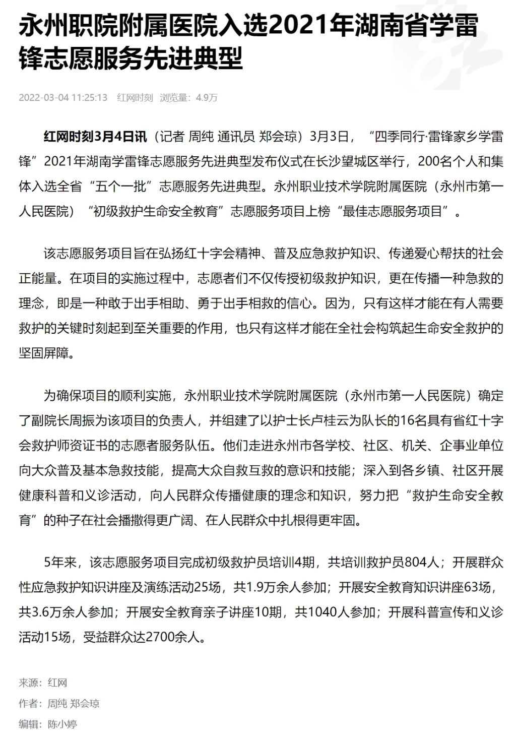 红网时刻3月4日讯(记者 周纯 通讯员 郑会琼)3月3日,“四季同行·雷锋家乡学雷锋”2021年湖南学雷锋志愿服务先进典型发布仪式在长沙望城区举行,200名个人和集体入选全省“五个一批”志愿服务先进典型。永州职业技术学院附属医院(永州市第一人民医院)“初级救护生命安全教育”志愿服务项目上榜“最佳志愿服务项目”。