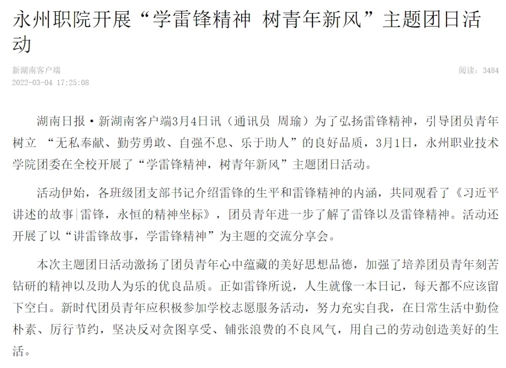 湖南日报·新湖南客户端3月4日讯(通讯员 周瑜)为了弘扬雷锋精神,引导团员青年树立 “无私奉献、勤劳勇敢、自强不息、乐于助人”的良好品质,3月1日,永州职业技术学院团委在全校开展了“学雷锋精神,树青年新风”主题团日活动。