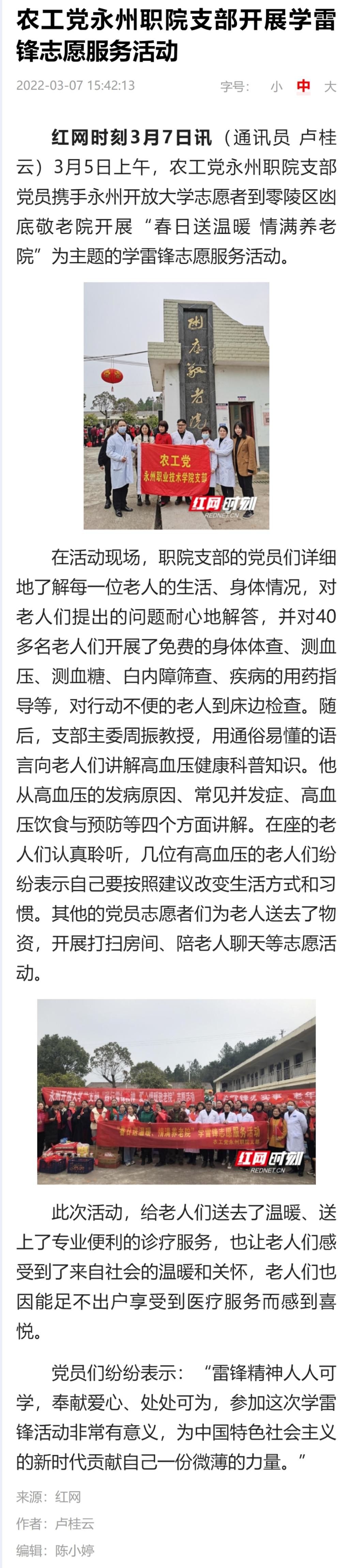 红网时刻3月7日讯(通讯员 卢桂云)3月5日上午,农工党永州职院支部党员携手永州开放大学志愿者到零陵区凼底敬老院开展“春日送温暖 情满养老院”为主题的学雷锋志愿服务活动。
