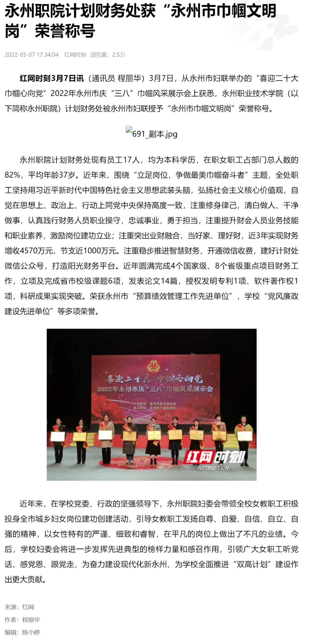 红网时刻3月7日讯(通讯员 程丽华)3月7日,从永州市妇联举办的“喜迎二十大 巾帼心向党”2022年永州市庆“三八”巾帼风采展示会上获悉,永州职业技术学院(以下简称永州职院)计划财务处被永州市妇联授予“永州市巾帼文明岗”荣誉称号。