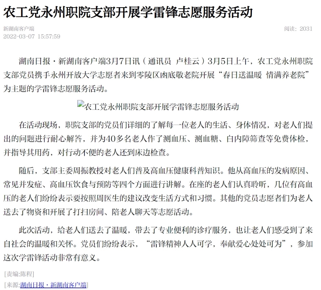 湖南日报·新湖南客户端3月7日讯(通讯员 卢桂云)3月5日上午,农工党永州职院支部党员携手永州开放大学志愿者来到零陵区凼底敬老院开展“春日送温暖 情满养老院”为主题的学雷锋志愿服务活动。