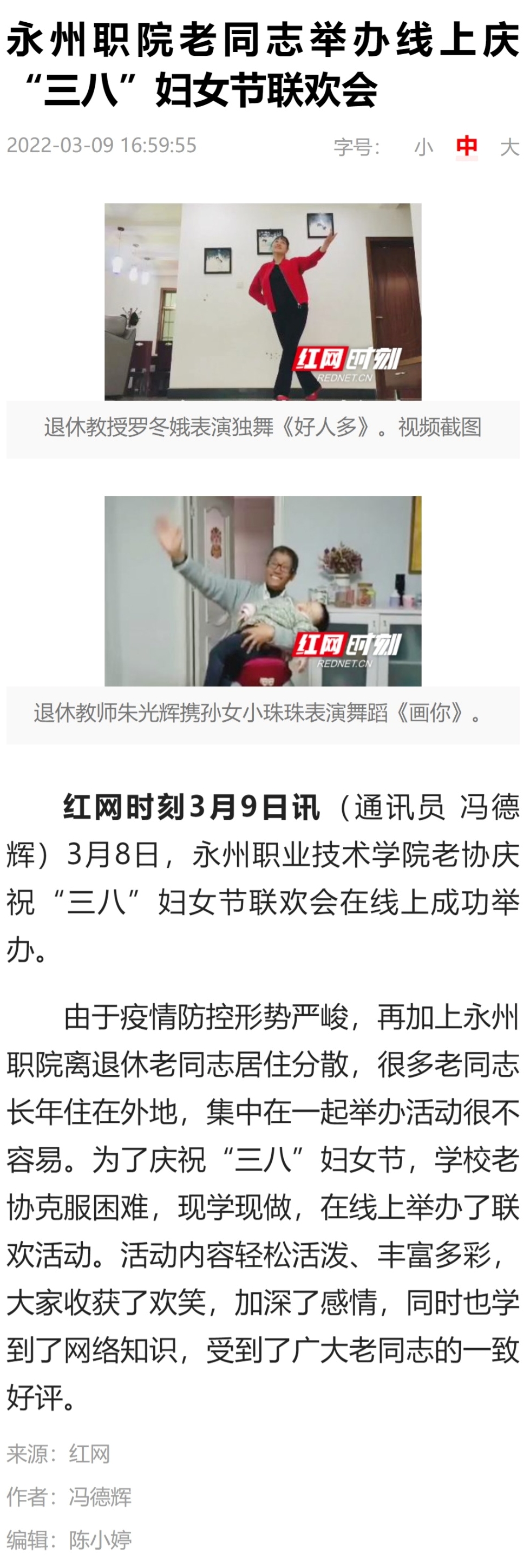 红网时刻3月9日讯(通讯员 冯德辉)3月8日,永州职业技术学院老协庆祝“三八”妇女节联欢会在线上成功举办。