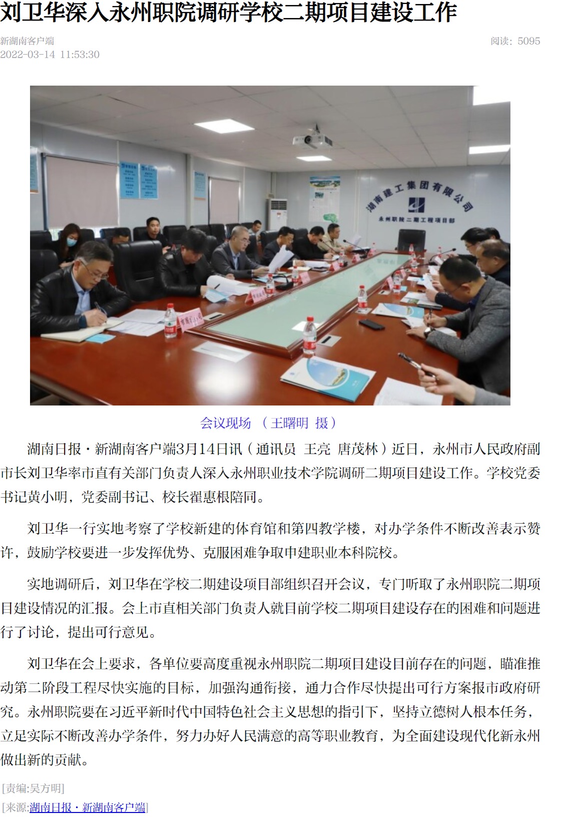 湖南日报·新湖南客户端3月14日讯(通讯员 王亮 唐茂林)近日,永州市人民政府副市长刘卫华率市直有关部门负责人深入永州职业技术学院调研二期项目建设工作。学校党委书记黄小明,党委副书记、校长翟惠根陪同。刘卫华一行实地考察了学校新建的体育馆和第四教学楼,对办学条件不断改善表示赞许,鼓励学校要进一步发挥优势、克服困难争取申建职业本科院校。实地调研后,刘卫华在学校二期建设项目部组织召开会议,专门听取了永州职院二期项目建设情况的汇报。会上市直相关部门负责人就目前学校二期项目建设存在的困难和问题进行了讨论,提出可行意见。刘卫华在会上要求,各单位要高度重视永州职院二期项目建设目前存在的问题,瞄准推动第二阶段工程尽快实施的目标,加强沟通衔接,通力合作尽快提出可行方案报市政府研究。永州职院要在习近平新时代中国特色社会主义思想的指引下,坚持立德树人根本任务,立足实际不断改善办学条件,努力办好人民满意的高等职业教育,为全面建设现代化新永州做出新的贡献。