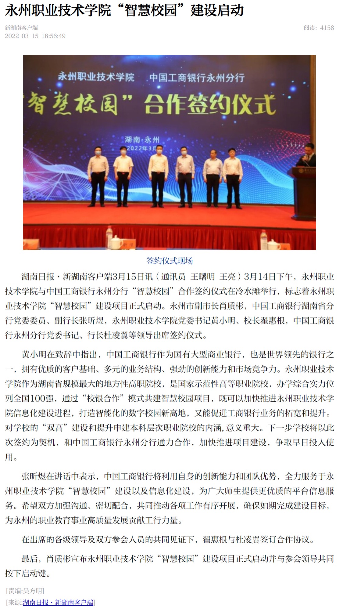 湖南日报·新湖南客户端3月15日讯(通讯员 王曙明 王亮)3月14日下午,永州职业技术学院与中国工商银行永州分行“智慧校园”合作签约仪式在冷水滩举行,标志着永州职业技术学院“智慧校园”建设项目正式启动。永州市副市长肖质彬,中国工商银行湖南省分行党委委员、副行长张昕煜,永州职业技术学院党委书记黄小明、校长翟惠根,中国工商银行永州分行党委书记、行长杜凌翼等领导出席签约仪式。黄小明在致辞中指出,中国工商银行作为国有大型商业银行,也是世界领先的银行之一,拥有优质的客户基础、多元的业务结构、强劲的创新能力和市场竞争力。永州职业技术学院作为湖南省规模最大的地方性高职院校,是国家示范性高等职业院校,办学综合实力位列全国100强,通过“校银合作”模式共建智慧校园项目,既可以加快推进永州职业技术学院信息化建设进程,打造智能化的数字校园新高地,又能促进工商银行业务的拓宽和提升。对学校的“双高”建设和提升申建本科层次职业院校的内涵,意义重大。下一步学校将以此次签约为契机,和中国工商银行永州分行通力合作,加快推进项目建设,争取早日投入使用。张昕煜在讲话中表示,中国工商银行将利用自身的创新能力和团队优势,全力服务于永州职业技术学院“智慧校园”建设以及信息化建设,为广大师生提供更优质的平台信息服务。希望双方加强沟通、密切配合,共同推动各项工作有序开展,确保如期完成建设目标,为永州的职业教育事业高质量发展贡献工行力量。在出席的各级领导及双方参会人员的共同见证下,翟惠根与杜凌翼签订合作协议。最后,肖质彬宣布永州职业技术学院“智慧校园”建设项目正式启动并与参会领导共同按下启动键。