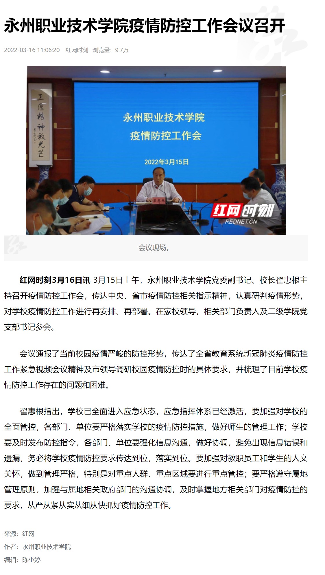红网时刻3月16日讯3月15日上午,永州职业技术学院党委副书记、校长翟惠根主持召开疫情防控工作会,传达中央、省市疫情防控相关指示精神,认真研判疫情形势,对学校疫情防控工作进行再安排、再部署。在家校领导,相关部门负责人及二级学院党支部书记参会。会议通报了当前校园疫情严峻的防控形势,传达了全省教育系统新冠肺炎疫情防控工作紧急视频会议精神及市领导调研校园疫情防控时的具体要求,并梳理了目前学校疫情防控工作存在的问题和困难。翟惠根指出,学校已全面进入应急状态,应急指挥体系已经激活,要加强对学校的全面管控,各部门、单位要严格落实学校的疫情防控措施,做好师生的管理工作;学校要及时发布防控指令,各部门、单位要强化信息沟通,做好协调,避免出现信息错误和遗漏,务必将学校疫情防控要求传达到位,落实到位。要加强对教职员工和学生的人文关怀,做到管理严格,特别是对重点人群、重点区域要进行重点管控;要严格遵守属地管理原则,加强与属地相关政府部门的沟通协调,及时掌握地方相关部门对疫情防控的要求,从严从紧从实从细从快抓好疫情防控工作。