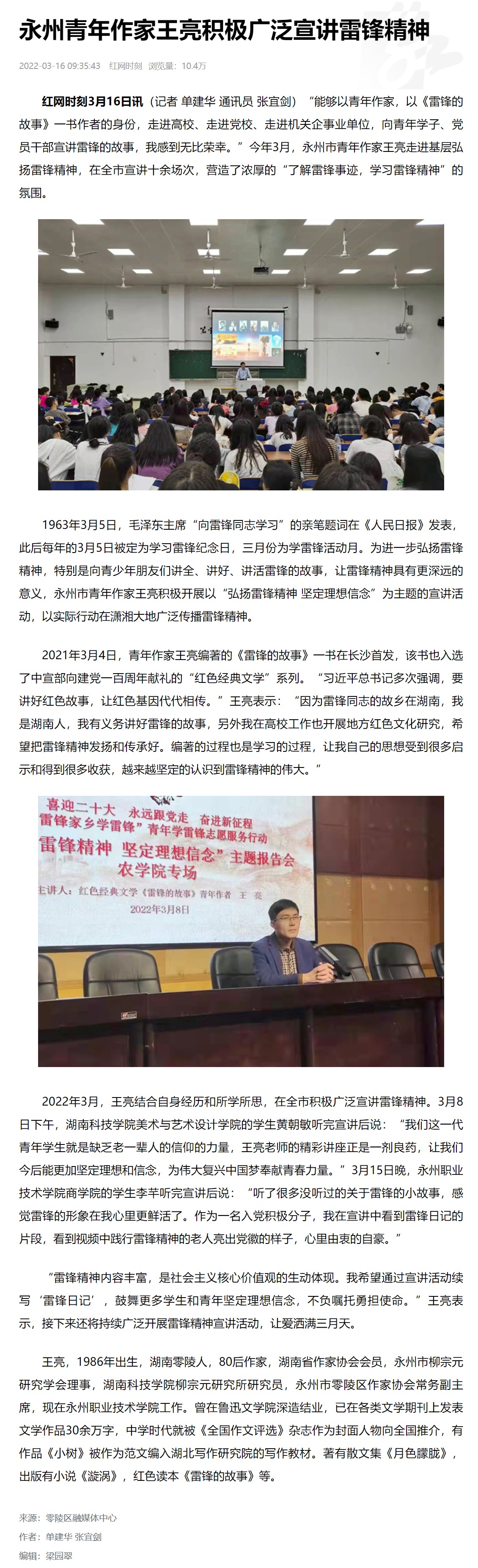 1963年3月5日,毛泽东主席“向雷锋同志学习”的亲笔题词在《人民日报》发表,此后每年的3月5日被定为学习雷锋纪念日,三月份为学雷锋活动月。为进一步弘扬雷锋精神,特别是向青少年朋友们讲全、讲好、讲活雷锋的故事,让雷锋精神具有更深远的意义,永州市青年作家王亮积极开展以“弘扬雷锋精神 坚定理想信念”为主题的宣讲活动,以实际行动在潇湘大地广泛传播雷锋精神。2021年3月4日,青年作家王亮编著的《雷锋的故事》一书在长沙首发,该书也入选了中宣部向建党一百周年献礼的“红色经典文学”系列。“习近平总书记多次强调,要讲好红色故事,让红色基因代代相传。”王亮表示:“因为雷锋同志的故乡在湖南,我是湖南人,我有义务讲好雷锋的故事,另外我在高校工作也开展地方红色文化研究,希望把雷锋精神发扬和传承好。编著的过程也是学习的过程,让我自己的思想受到很多启示和得到很多收获,越来越坚定的认识到雷锋精神的伟大。”2022年3月,王亮结合自身经历和所学所思,在全市积极广泛宣讲雷锋精神。3月8日下午,湖南科技学院美术与艺术设计学院的学生黄朝敏听完宣讲后说:“我们这一代青年学生就是缺乏老一辈人的信仰的力量,王亮老师的精彩讲座正是一剂良药,让我们今后能更加坚定理想和信念,为伟大复兴中国梦奉献青春力量。”3月15日晚,永州职业技术学院商学院的学生李芊听完宣讲后说:“听了很多没听过的关于雷锋的小故事,感觉雷锋的形象在我心里更鲜活了。作为一名入党积极分子,我在宣讲中看到雷锋日记的片段,看到视频中践行雷锋精神的老人亮出党徽的样子,心里由衷的自豪。”“雷锋精神内容丰富,是社会主义核心价值观的生动体现。我希望通过宣讲活动续写‘雷锋日记’,鼓舞更多学生和青年坚定理想信念,不负嘱托勇担使命。”王亮表示,接下来还将持续广泛开展雷锋精神宣讲活动,让爱洒满三月天。王亮,1986年出生,湖南零陵人,80后作家,湖南省作家协会会员,永州市柳宗元研究学会理事,湖南科技学院柳宗元研究所研究员,永州市零陵区作家协会常务副主席,现在永州职业技术学院工作。曾在鲁迅文学院深造结业,已在各类文学期刊上发表文学作品30余万字,中学时代就被《全国作文评选》杂志作为封面人物向全国推介,有作品《小树》被作为范文编入湖北写作研究院的写作教材。著有散文集《月色朦胧》,出版有小说《漩涡》,红色读本《雷锋的故事》等。