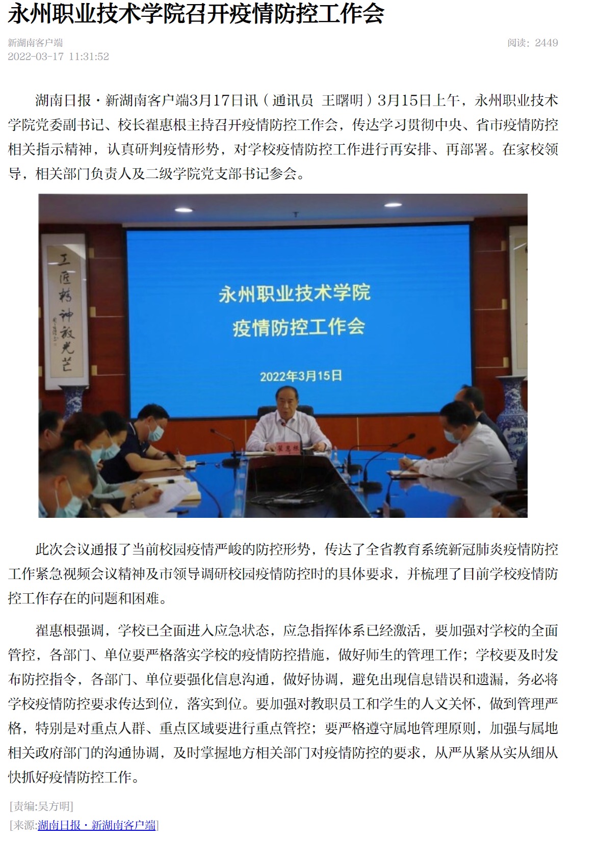 湖南日报·新湖南客户端3月17日讯(通讯员 王曙明)3月15日上午,永州职业技术学院党委副书记、校长翟惠根主持召开疫情防控工作会,传达学习贯彻中央、省市疫情防控相关指示精神,认真研判疫情形势,对学校疫情防控工作进行再安排、再部署。在家校领导,相关部门负责人及二级学院党支部书记参会。此次会议通报了当前校园疫情严峻的防控形势,传达了全省教育系统新冠肺炎疫情防控工作紧急视频会议精神及市领导调研校园疫情防控时的具体要求,并梳理了目前学校疫情防控工作存在的问题和困难。翟惠根强调,学校已全面进入应急状态,应急指挥体系已经激活,要加强对学校的全面管控,各部门、单位要严格落实学校的疫情防控措施,做好师生的管理工作;学校要及时发布防控指令,各部门、单位要强化信息沟通,做好协调,避免出现信息错误和遗漏,务必将学校疫情防控要求传达到位,落实到位。要加强对教职员工和学生的人文关怀,做到管理严格,特别是对重点人群、重点区域要进行重点管控;要严格遵守属地管理原则,加强与属地相关政府部门的沟通协调,及时掌握地方相关部门对疫情防控的要求,从严从紧从实从细从快抓好疫情防控工作。
