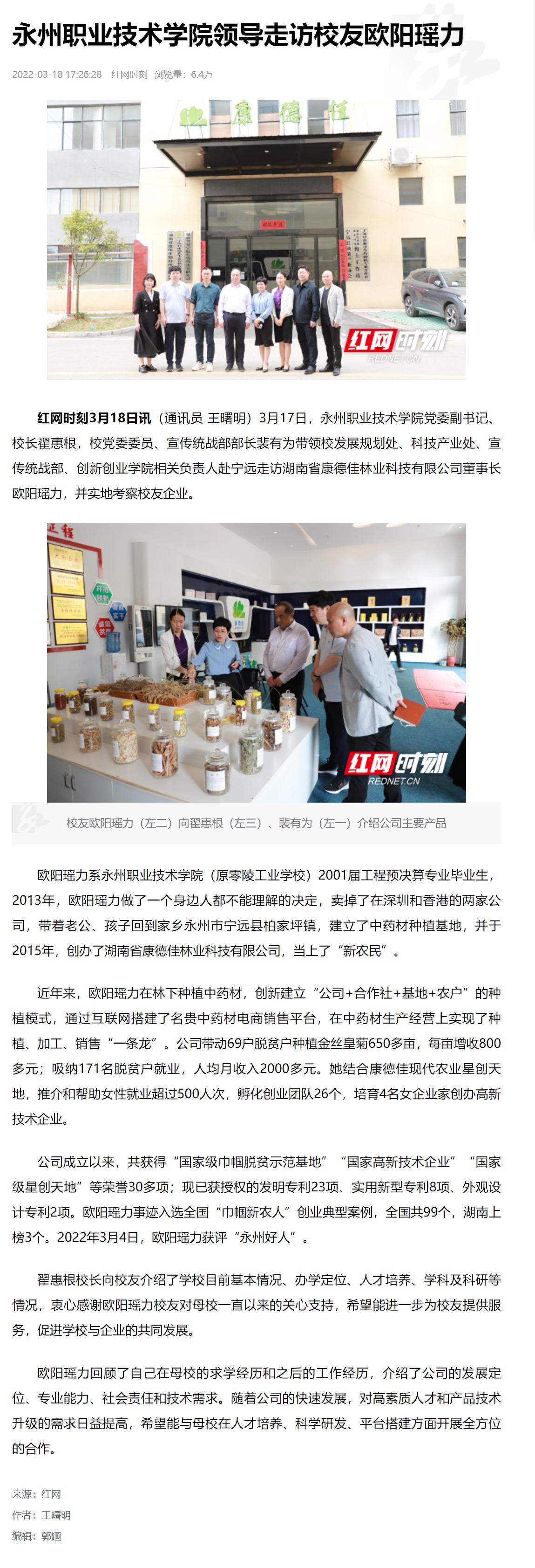 红网时刻3月18日讯(通讯员 王曙明)3月17日,永州职业技术学院党委副书记、校长翟惠根,校党委委员、宣传统战部部长裴有为带领校发展规划处、科技产业处、宣传统战部、创新创业学院相关负责人赴宁远走访湖南省康德佳林业科技有限公司董事长欧阳瑶力,并实地考察校友企业。欧阳瑶力系永州职业技术学院(原零陵工业学校)2001届工程预决算专业毕业生,2013年,欧阳瑶力做了一个身边人都不能理解的决定,卖掉了在深圳和香港的两家公司,带着老公、孩子回到家乡永州市宁远县柏家坪镇,建立了中药材种植基地,并于2015年,创办了湖南省康德佳林业科技有限公司,当上了“新农民”。近年来,欧阳瑶力在林下种植中药材,创新建立“公司+合作社+基地+农户”的种植模式,通过互联网搭建了名贵中药材电商销售平台,在中药材生产经营上实现了种植、加工、销售“一条龙”。公司带动69户脱贫户种植金丝皇菊650多亩,每亩增收800多元;吸纳171名脱贫户就业,人均月收入2000多元。她结合康德佳现代农业星创天地,推介和帮助女性就业超过500人次,孵化创业团队26个,培育4名女企业家创办高新技术企业。公司成立以来,共获得“国家级巾帼脱贫示范基地”“国家高新技术企业”“国家级星创天地”等荣誉30多项;现已获授权的发明专利23项、实用新型专利8项、外观设计专利2项。欧阳瑶力事迹入选全国“巾帼新农人”创业典型案例,全国共99个,湖南上榜3个。2022年3月4日,欧阳瑶力获评“永州好人”。翟惠根校长向校友介绍了学校目前基本情况、办学定位、人才培养、学科及科研等情况,衷心感谢欧阳瑶力校友对母校一直以来的关心支持,希望能进一步为校友提供服务,促进学校与企业的共同发展。欧阳瑶力回顾了自己在母校的求学经历和之后的工作经历,介绍了公司的发展定位、专业能力、社会责任和技术需求。随着公司的快速发展,对高素质人才和产品技术升级的需求日益提高,希望能与母校在人才培养、科学研发、平台搭建方面开展全方位的合作。