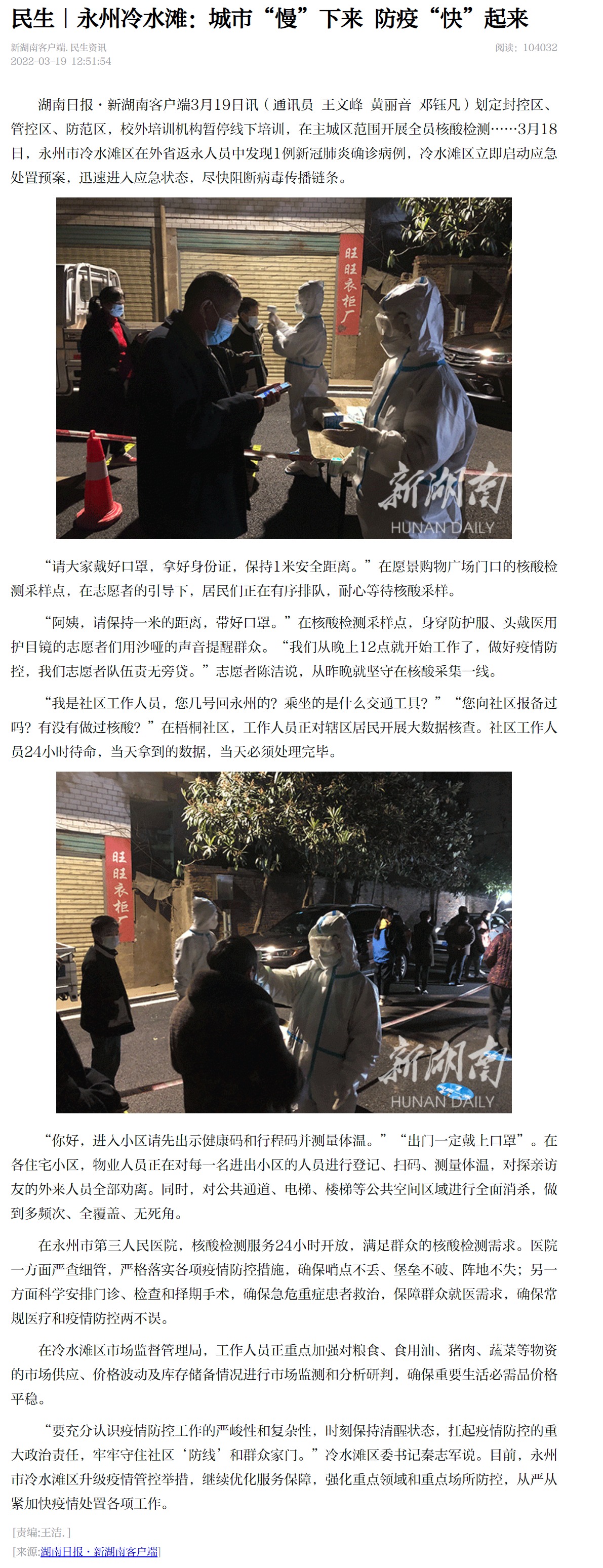 湖南日报·新湖南客户端3月19日讯(通讯员 王文峰 黄丽音 邓钰凡)划定封控区、管控区、防范区,校外培训机构暂停线下培训,在主城区范围开展全员核酸检测……3月18日,永州市冷水滩区在外省返永人员中发现1例新冠肺炎确诊病例,冷水滩区立即启动应急处置预案,迅速进入应急状态,尽快阻断病毒传播链条。“请大家戴好口罩,拿好身份证,保持1米安全距离。”在愿景购物广场门口的核酸检测采样点,在志愿者的引导下,居民们正在有序排队,耐心等待核酸采样。“阿姨,请保持一米的距离,带好口罩。”在核酸检测采样点,身穿防护服、头戴医用护目镜的志愿者们用沙哑的声音提醒群众。“我们从晚上12点就开始工作了,做好疫情防控,我们志愿者队伍责无旁贷。”志愿者陈洁说,从昨晚就坚守在核酸采集一线。“我是社区工作人员,您几号回永州的?乘坐的是什么交通工具?”“您向社区报备过吗?有没有做过核酸?”在梧桐社区,工作人员正对辖区居民开展大数据核查。社区工作人员24小时待命,当天拿到的数据,当天必须处理完毕。“你好,进入小区请先出示健康码和行程码并测量体温。”“出门一定戴上口罩”。在各住宅小区,物业人员正在对每一名进出小区的人员进行登记、扫码、测量体温,对探亲访友的外来人员全部劝离。同时,对公共通道、电梯、楼梯等公共空间区域进行全面消杀,做到多频次、全覆盖、无死角。在永州市第三人民医院,核酸检测服务24小时开放,满足群众的核酸检测需求。医院一方面严查细管,严格落实各项疫情防控措施,确保哨点不丢、堡垒不破、阵地不失;另一方面科学安排门诊、检查和择期手术,确保急危重症患者救治,保障群众就医需求,确保常规医疗和疫情防控两不误。在冷水滩区市场监督管理局,工作人员正重点加强对粮食、食用油、猪肉、蔬菜等物资的市场供应、价格波动及库存储备情况进行市场监测和分析研判,确保重要生活必需品价格平稳。“要充分认识疫情防控工作的严峻性和复杂性,时刻保持清醒状态,扛起疫情防控的重大政治责任,牢牢守住社区‘防线’和群众家门。”冷水滩区委书记秦志军说。目前,永州市冷水滩区升级疫情管控举措,继续优化服务保障,强化重点领域和重点场所防控,从严从紧加快疫情处置各项工作。