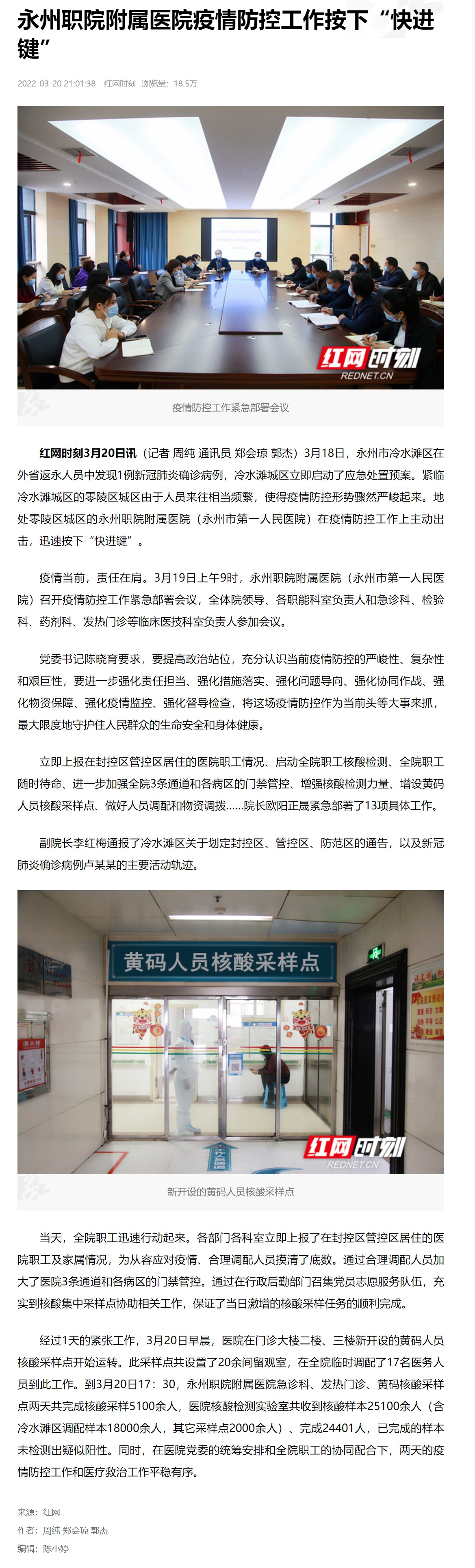 红网时刻3月20日讯(记者 周纯 通讯员 郑会琼 郭杰)3月18日,永州市冷水滩区在外省返永人员中发现1例新冠肺炎确诊病例,冷水滩城区立即启动了应急处置预案。紧临冷水滩城区的零陵区城区由于人员来往相当频繁,使得疫情防控形势骤然严峻起来。地处零陵区城区的永州职院附属医院(永州市第一人民医院)在疫情防控工作上主动出击,迅速按下“快进键”。疫情当前,责任在肩。3月19日上午9时,永州职院附属医院(永州市第一人民医院)召开疫情防控工作紧急部署会议,全体院领导、各职能科室负责人和急诊科、检验科、药剂科、发热门诊等临床医技科室负责人参加会议。党委书记陈晓育要求,要提高政治站位,充分认识当前疫情防控的严峻性、复杂性和艰巨性,要进一步强化责任担当、强化措施落实、强化问题导向、强化协同作战、强化物资保障、强化疫情监控、强化督导检查,将这场疫情防控作为当前头等大事来抓,最大限度地守护住人民群众的生命安全和身体健康。立即上报在封控区管控区居住的医院职工情况、启动全院职工核酸检测、全院职工随时待命、进一步加强全院3条通道和各病区的门禁管控、增强核酸检测力量、增设黄码人员核酸采样点、做好人员调配和物资调拨……院长欧阳正晟紧急部署了13项具体工作。副院长李红梅通报了冷水滩区关于划定封控区、管控区、防范区的通告,以及新冠肺炎确诊病例卢某某的主要活动轨迹。当天,全院职工迅速行动起来。各部门各科室立即上报了在封控区管控区居住的医院职工及家属情况,为从容应对疫情、合理调配人员摸清了底数。通过合理调配人员加大了医院3条通道和各病区的门禁管控。通过在行政后勤部门召集党员志愿服务队伍,充实到核酸集中采样点协助相关工作,保证了当日激增的核酸采样任务的顺利完成。经过1天的紧张工作,3月20日早晨,医院在门诊大楼二楼、三楼新开设的黄码人员核酸采样点开始运转。此采样点共设置了20余间留观室,在全院临时调配了17名医务人员到此工作。到3月20日17:30,永州职院附属医院急诊科、发热门诊、黄码核酸采样点两天共完成核酸采样5100余人,医院核酸检测实验室共收到核酸样本25100余人(含冷水滩区调配样本18000余人,其它采样点2000余人)、完成24401人,已完成的样本未检测出疑似阳性。同时,在医院党委的统筹安排和全院职工的协同配合下,两天的疫情防控工作和医疗救治工作平稳有序。