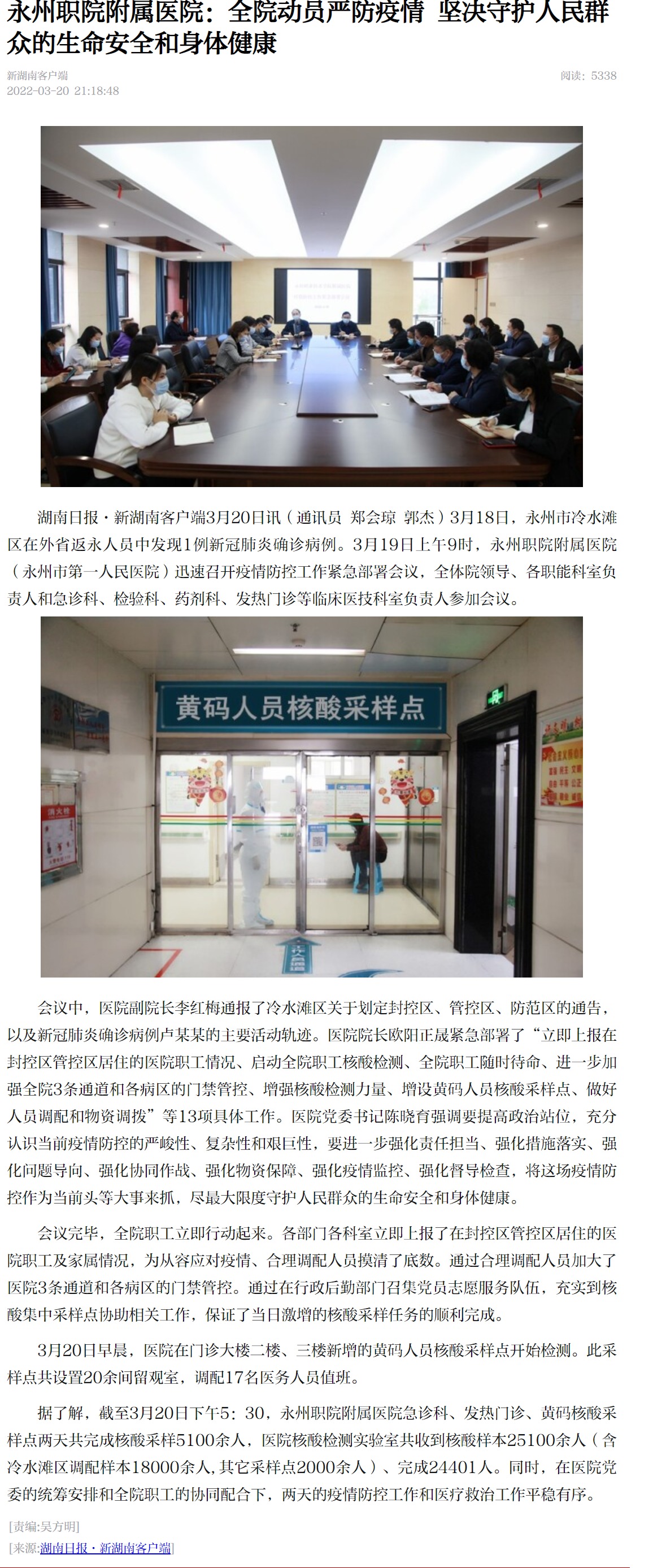 湖南日报·新湖南客户端3月20日讯(通讯员 郑会琼 郭杰)3月18日,永州市冷水滩区在外省返永人员中发现1例新冠肺炎确诊病例。3月19日上午9时,永州职院附属医院(永州市第一人民医院)迅速召开疫情防控工作紧急部署会议,全体院领导、各职能科室负责人和急诊科、检验科、药剂科、发热门诊等临床医技科室负责人参加会议。会议中,医院副院长李红梅通报了冷水滩区关于划定封控区、管控区、防范区的通告,以及新冠肺炎确诊病例卢某某的主要活动轨迹。医院院长欧阳正晟紧急部署了“立即上报在封控区管控区居住的医院职工情况、启动全院职工核酸检测、全院职工随时待命、进一步加强全院3条通道和各病区的门禁管控、增强核酸检测力量、增设黄码人员核酸采样点、做好人员调配和物资调拨”等13项具体工作。医院党委书记陈晓育强调要提高政治站位,充分认识当前疫情防控的严峻性、复杂性和艰巨性,要进一步强化责任担当、强化措施落实、强化问题导向、强化协同作战、强化物资保障、强化疫情监控、强化督导检查,将这场疫情防控作为当前头等大事来抓,尽最大限度守护人民群众的生命安全和身体健康。会议完毕,全院职工立即行动起来。各部门各科室立即上报了在封控区管控区居住的医院职工及家属情况,为从容应对疫情、合理调配人员摸清了底数。通过合理调配人员加大了医院3条通道和各病区的门禁管控。通过在行政后勤部门召集党员志愿服务队伍,充实到核酸集中采样点协助相关工作,保证了当日激增的核酸采样任务的顺利完成。3月20日早晨,医院在门诊大楼二楼、三楼新增的黄码人员核酸采样点开始检测。此采样点共设置20余间留观室,调配17名医务人员值班。据了解,截至3月20日下午5:30,永州职院附属医院急诊科、发热门诊、黄码核酸采样点两天共完成核酸采样5100余人,医院核酸检测实验室共收到核酸样本25100余人(含冷水滩区调配样本18000余人,其它采样点2000余人)、完成24401人。同时,在医院党委的统筹安排和全院职工的协同配合下,两天的疫情防控工作和医疗救治工作平稳有序。