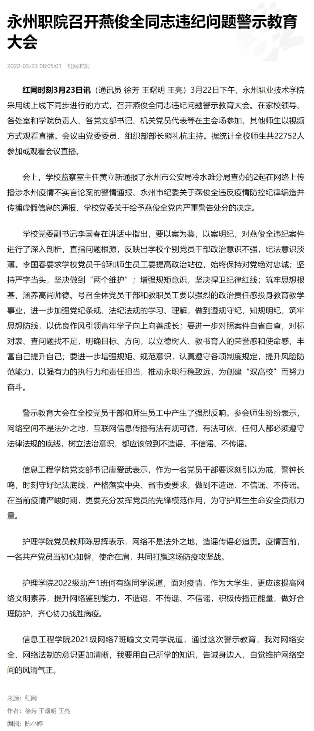 会上,学校监察室主任黄立新通报了永州市公安局冷水滩分局查办的2起在网络上传播涉永州疫情不实言论案的警情通报、永州市纪委关于燕俊全违反疫情防控纪律编造并传播虚假信息的通报、学校党委关于给予燕俊全党内严重警告处分的决定。