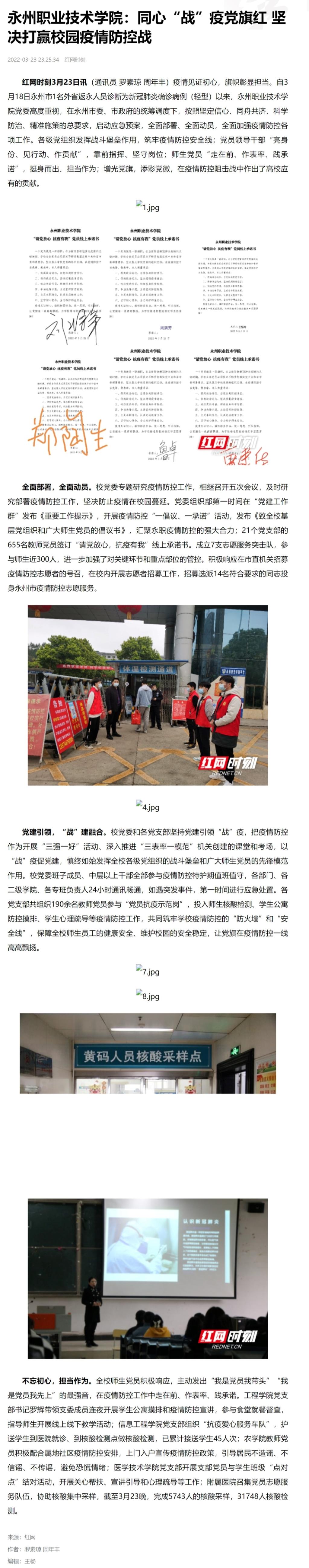 红网时刻3月23日讯(通讯员 罗素琼 周年丰)疫情见证初心,旗帜彰显担当。自3月18日永州市1名外省返永人员诊断为新冠肺炎确诊病例(轻型)以来,永州职业技术学院党委高度重视,在永州市委、市政府的统筹调度下,按照坚定信心、同舟共济、科学防治、精准施策的总要求,启动应急预案,全面部署、全面动员,全面加强疫情防控各项工作。各级党组织发挥战斗堡垒作用,筑牢疫情防控安全线;党员领导干部“亮身份、见行动、作贡献”,靠前指挥、坚守岗位;师生党员“走在前、作表率、践承诺”,挺身而出、担当作为;增光党旗,添彩党徽,在疫情防控阻击战中作出了高校应有的贡献。