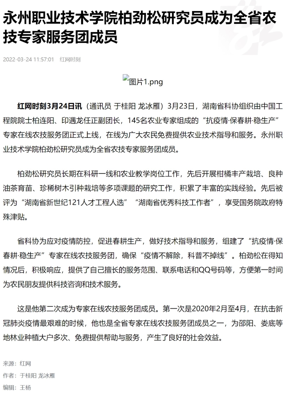 红网时刻3月24日讯(通讯员 于桂阳 龙冰雁)3月23日,湖南省科协组织由中国工程院院士柏连阳、印遇龙任正副团长,145名农业专家组成的“抗疫情·保春耕·稳生产”专家在线农技服务团正式上线,在线为广大农民免费提供农业技术指导和服务。永州职业技术学院柏劲松研究员成为全省农技专家服务团成员。