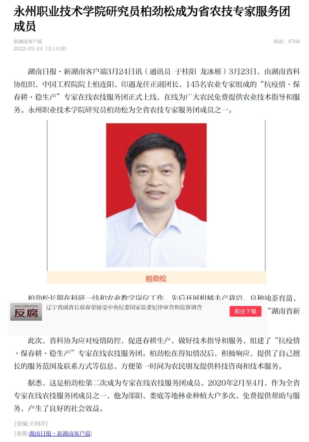 湖南日报·新湖南客户端3月24日讯(通讯员 于桂阳 龙冰雁)3月23日,由湖南省科协组织,中国工程院院士柏连阳、印遇龙任正副团长,145名农业专家组成的“抗疫情·保春耕·稳生产”专家在线农技服务团正式上线,在线为广大农民免费提供农业技术指导和服务。永州职业技术学院研究员柏劲松为全省农技专家服务团成员之一。