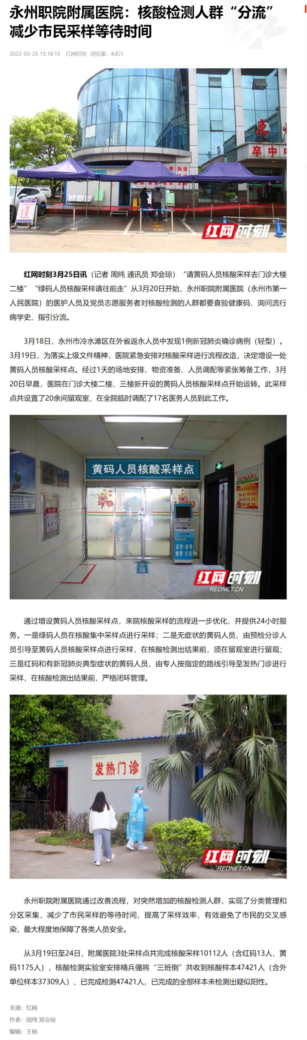 红网时刻3月25日讯(记者 周纯 通讯员 郑会琼)“请黄码人员核酸采样去门诊大楼二楼”“绿码人员核酸采样请往前走”从3月20日开始,永州职院附属医院(永州市第一人民医院)的医护人员及党员志愿服务者对核酸检测的人群都要查验健康码、询问流行病学史、指引分流。