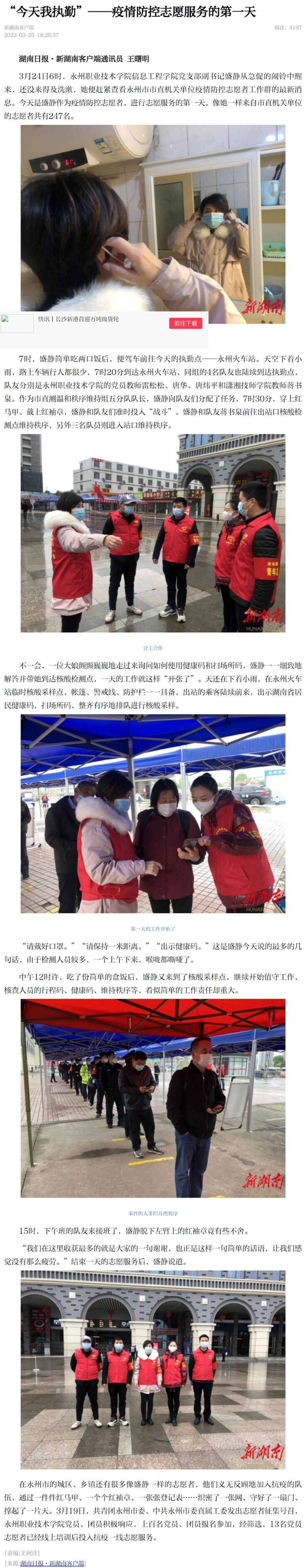 3月24日6时,永州职业技术学院信息工程学院党支部副书记盛静从急促的闹铃中醒来,还没来得及洗漱,她便赶紧查看永州市市直机关单位疫情防控志愿者工作群的最新消息。今天是盛静作为疫情防控志愿者,进行志愿服务的第一天,像她一样来自市直机关单位的志愿者共有247名。