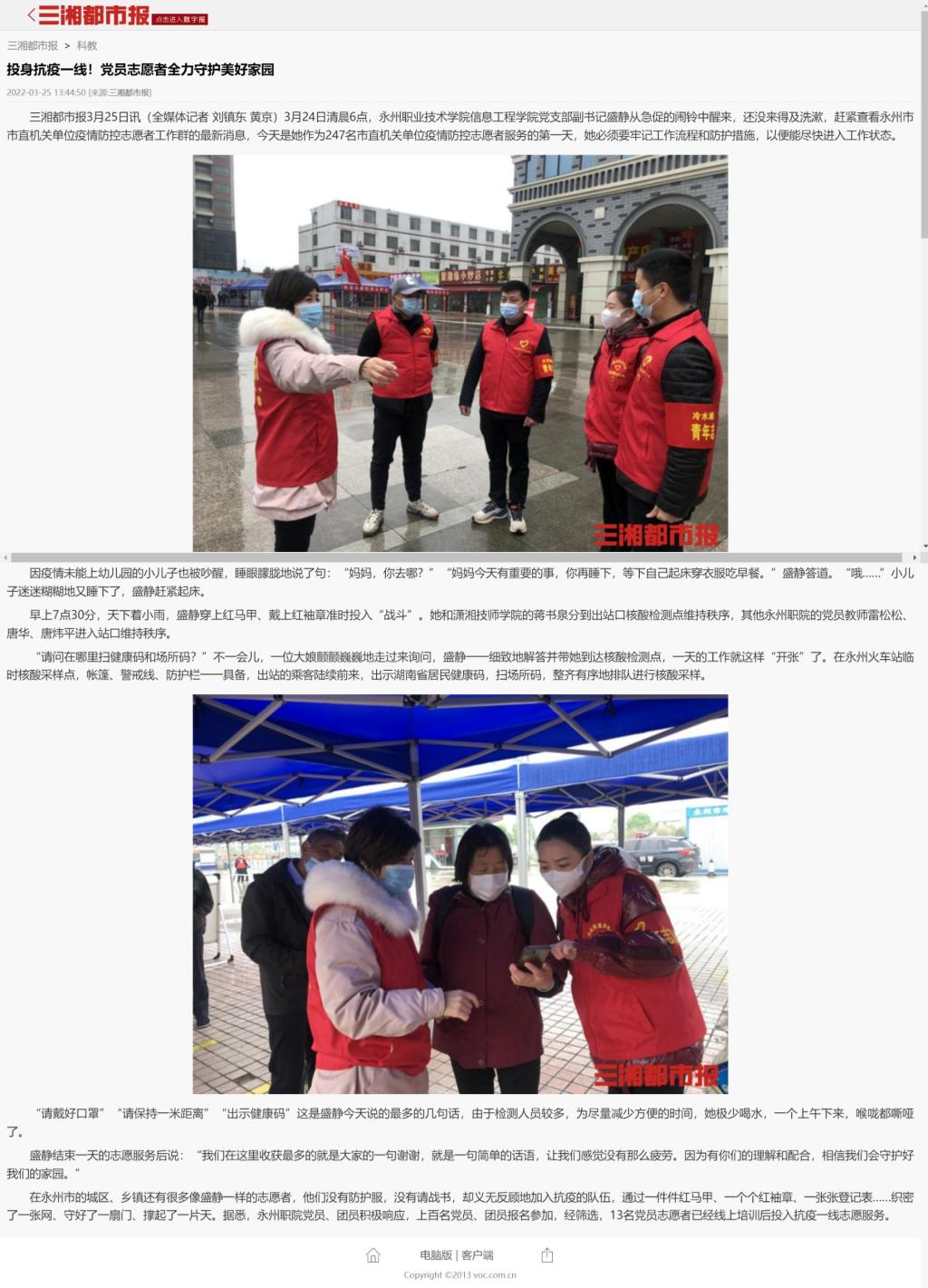 三湘都市报3月25日讯(全媒体记者 刘镇东 黄京)3月24日清晨6点,永州职业技术学院信息工程学院党支部副书记盛静从急促的闹铃中醒来,还没来得及洗漱,赶紧查看永州市市直机关单位疫情防控志愿者工作群的最新消息,今天是她作为247名市直机关单位疫情防控志愿者服务的第一天,她必须要牢记工作流程和防护措施,以便能尽快进入工作状态。