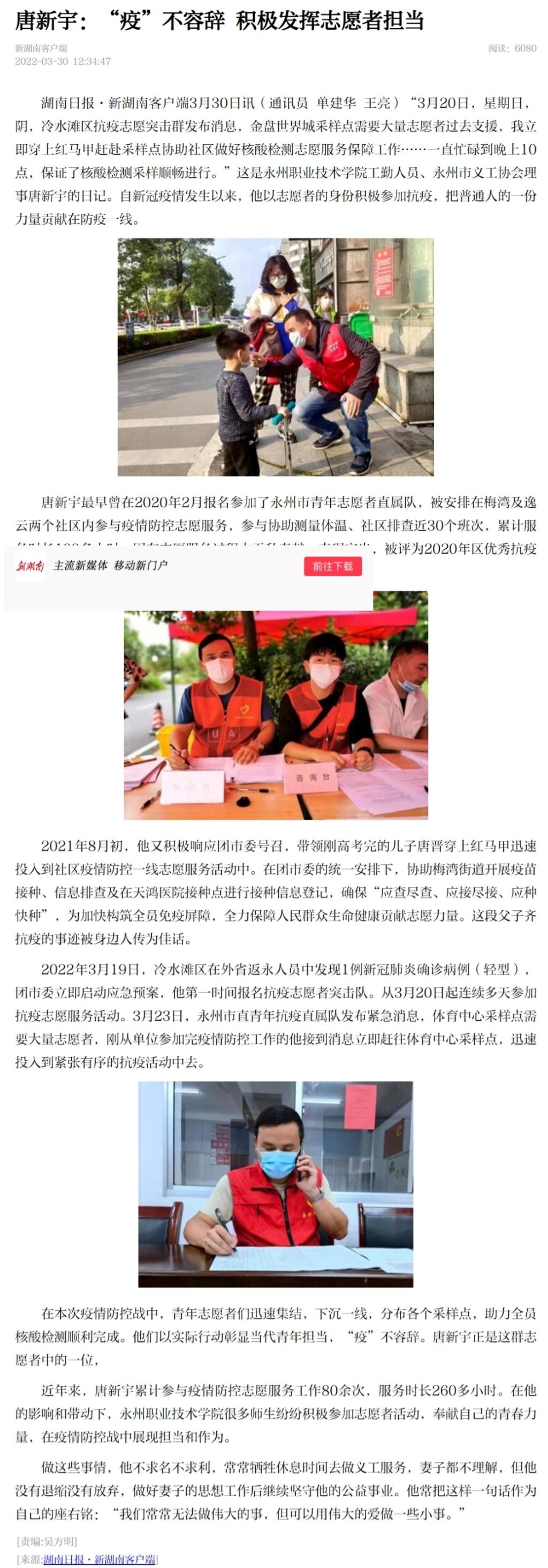 近年来,唐新宇累计参与疫情防控志愿服务工作80余次,服务时长260多小时。在他的影响和带动下,永州职业技术学院很多师生纷纷积极参加志愿者活动,奉献自己的青春力量,在疫情防控战中展现担当和作为。