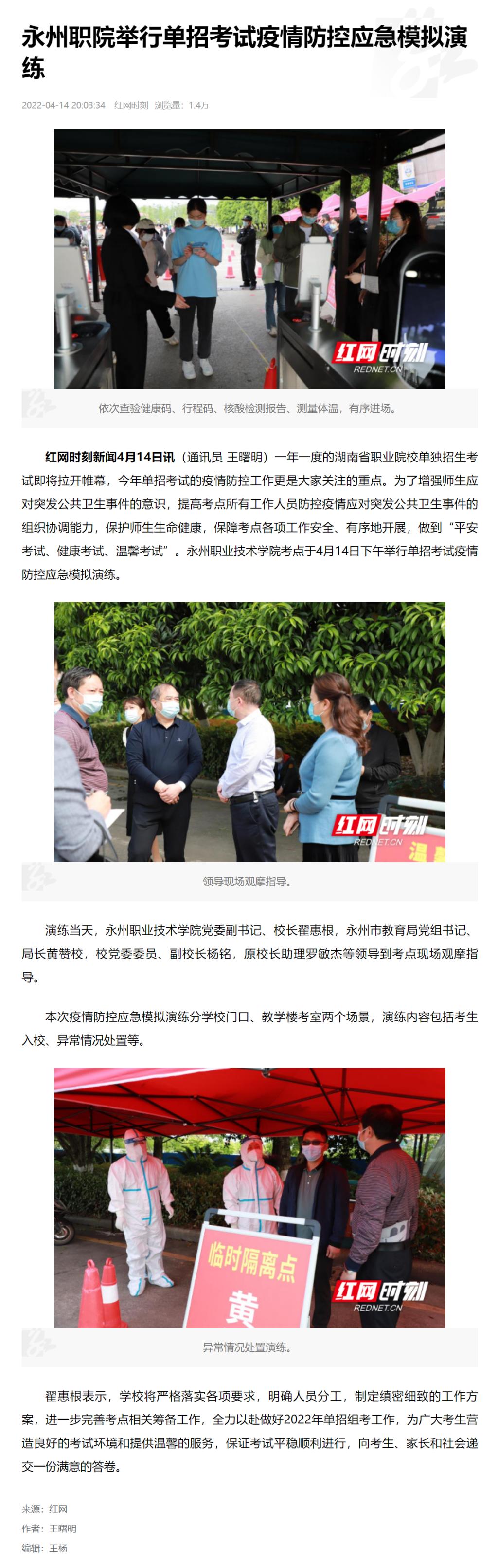 红网时刻新闻4月14日讯(通讯员 王曙明)一年一度的湖南省职业院校单独招生考试即将拉开帷幕,今年单招考试的疫情防控工作更是大家关注的重点。为了增强师生应对突发公共卫生事件的意识,提高考点所有工作人员防控疫情应对突发公共卫生事件的组织协调能力,保护师生生命健康,保障考点各项工作安全、有序地开展,做到“平安考试、健康考试、温馨考试”。永州职业技术学院考点于4月14日下午举行单招考试疫情防控应急模拟演练。