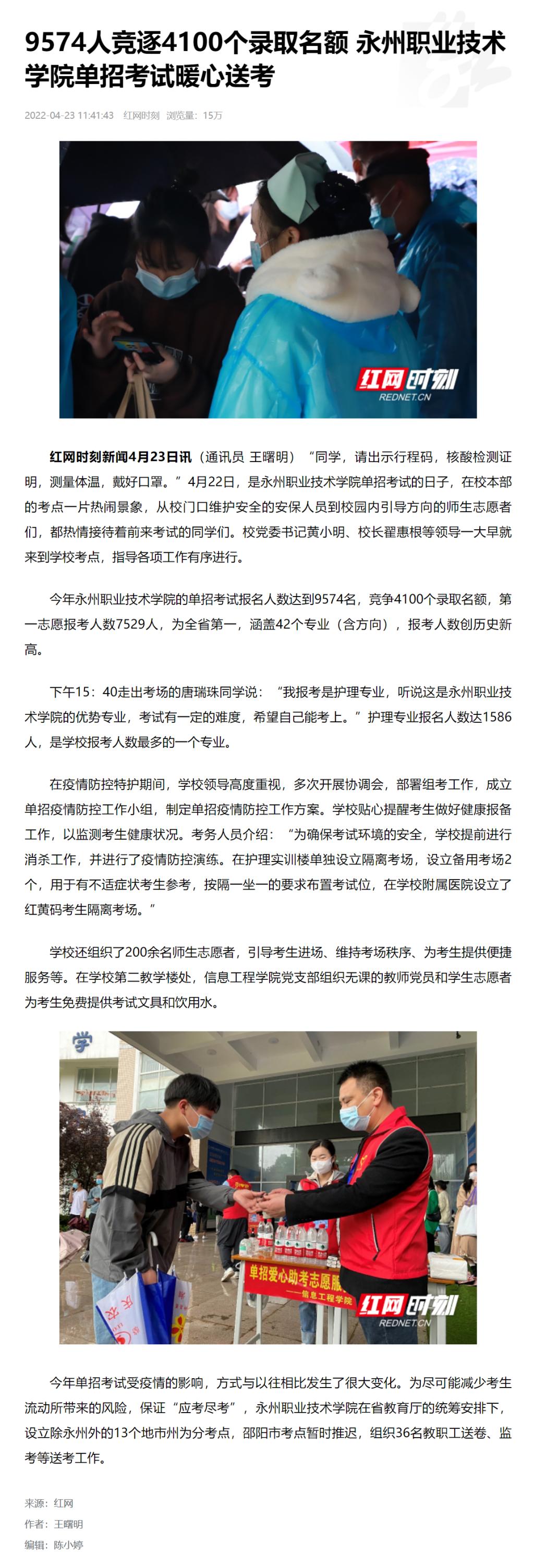 红网时刻新闻4月23日讯(通讯员 王曙明)“同学,请出示行程码,核酸检测证明,测量体温,戴好口罩。”4月22日,是永州职业技术学院单招考试的日子,在校本部的考点一片热闹景象,从校门口维护安全的安保人员到校园内引导方向的师生志愿者们,都热情接待着前来考试的同学们。校党委书记黄小明、校长翟惠根等领导一大早就来到学校考点,指导各项工作有序进行。
