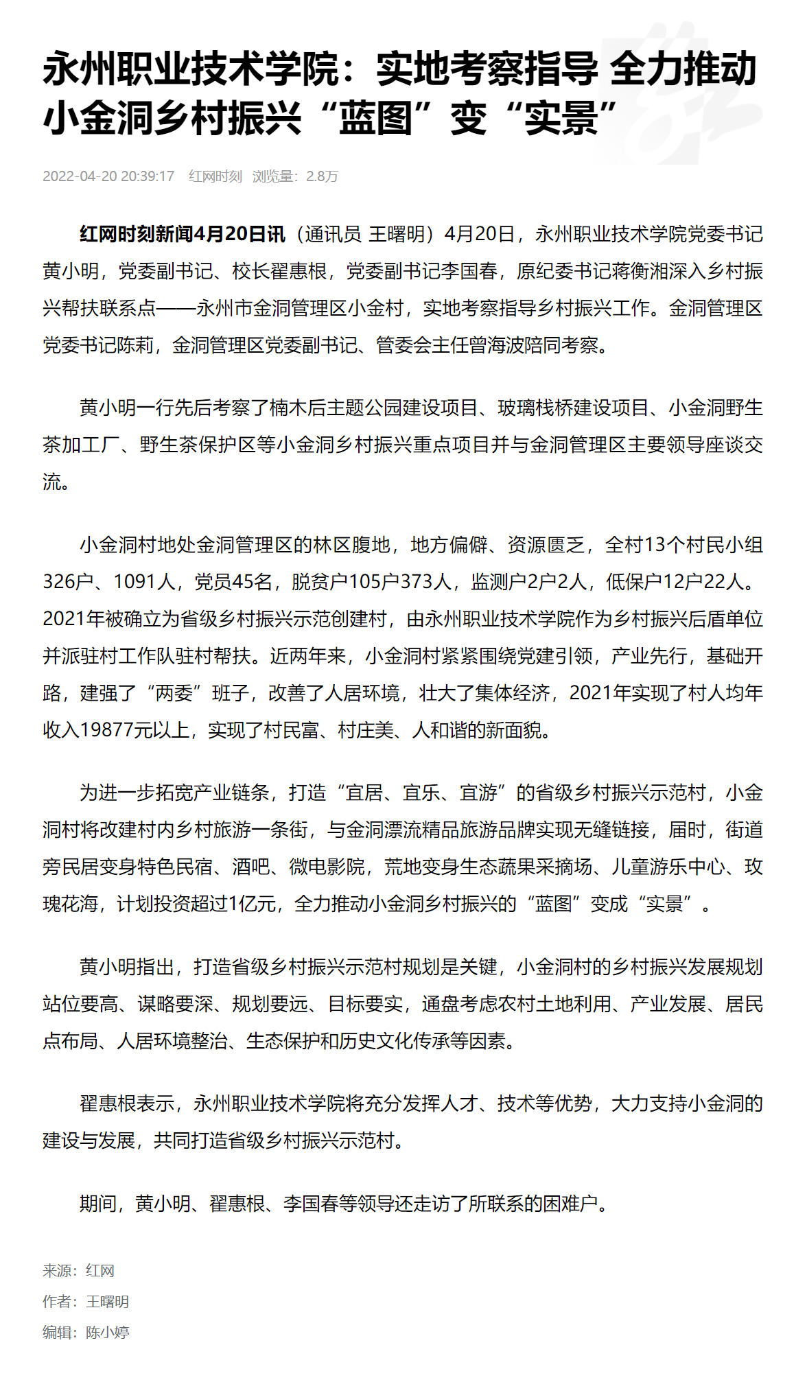 翟惠根表示,永州职业技术学院将充分发挥人才、技术等优势,大力支持小金洞的建设与发展,共同打造省级乡村振兴示范村。