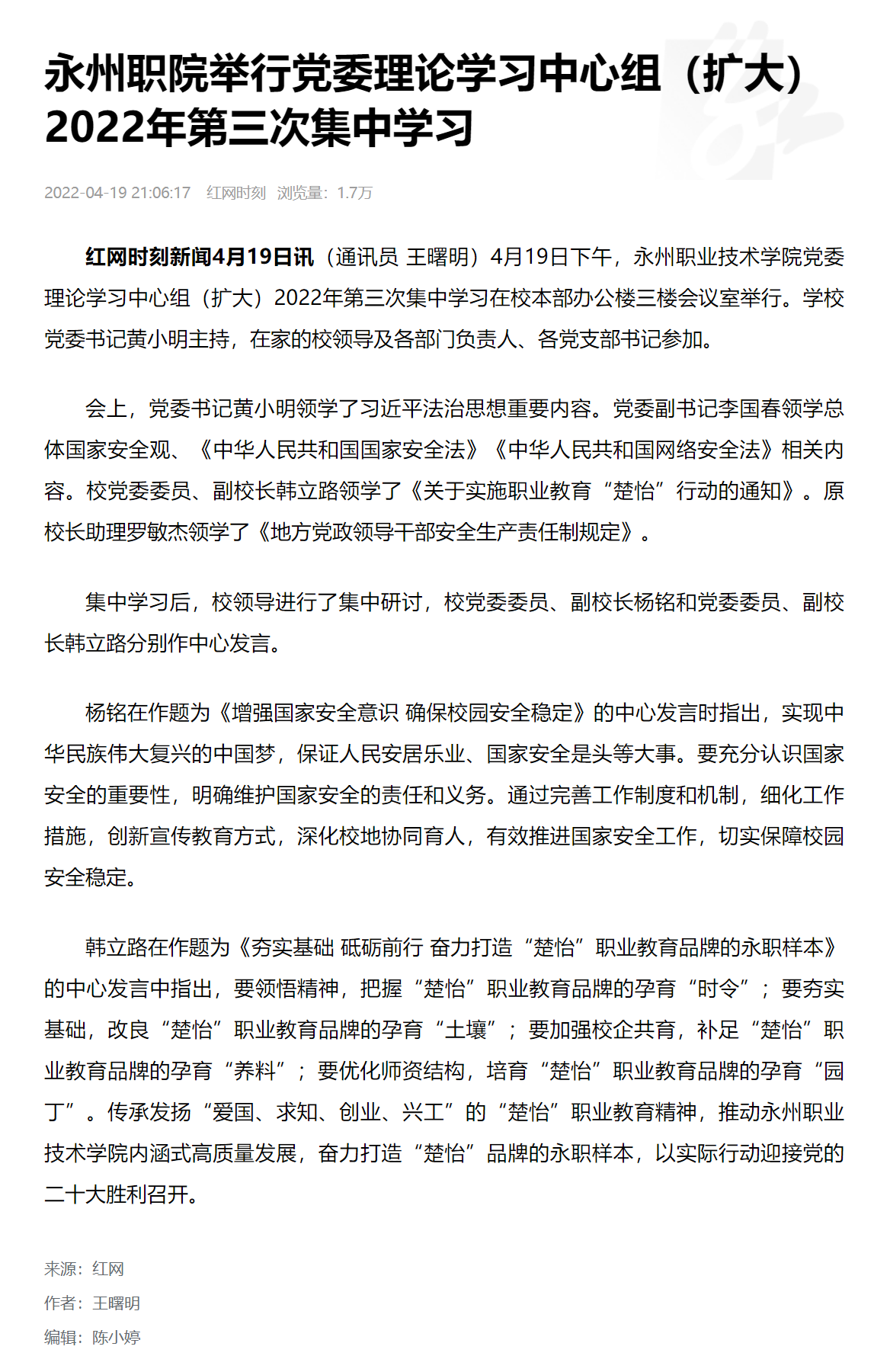 红网时刻新闻4月19日讯(通讯员 王曙明)4月19日下午,永州职业技术学院党委理论学习中心组(扩大)2022年第三次集中学习在校本部办公楼三楼会议室举行。学校党委书记黄小明主持,在家的校领导及各部门负责人、各党支部书记参加。