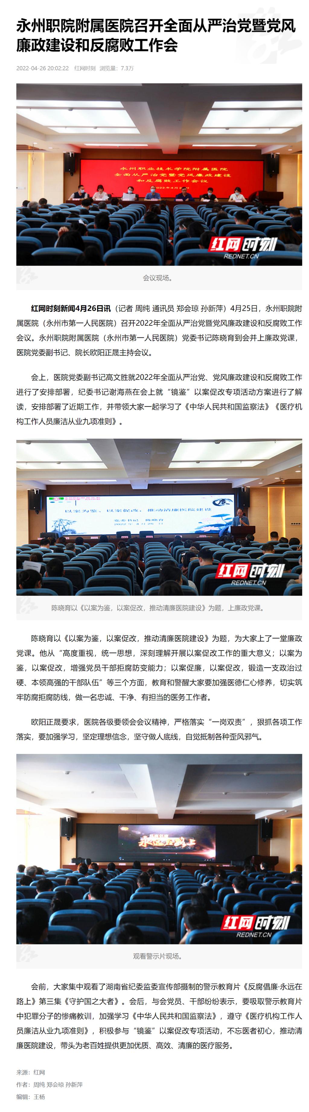 红网时刻新闻4月26日讯(记者 周纯 通讯员 郑会琼 孙新萍)4月25日,永州职院附属医院(永州市第一人民医院)召开2022年全面从严治党暨党风廉政建设和反腐败工作会议。永州职院附属医院(永州市第一人民医院)党委书记陈晓育到会并上廉政党课,医院党委副书记、院长欧阳正晟主持会议。