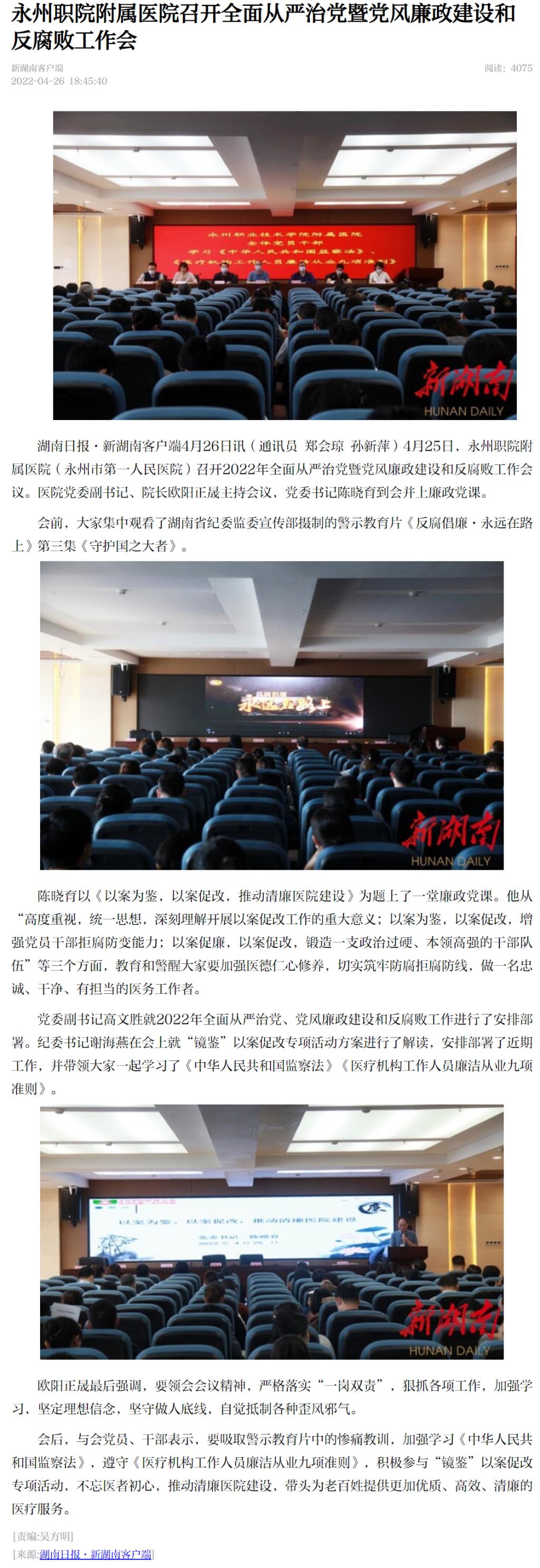 湖南日报·新湖南客户端4月26日讯(通讯员 郑会琼 孙新萍)4月25日,永州职院附属医院(永州市第一人民医院)召开2022年全面从严治党暨党风廉政建设和反腐败工作会议。医院党委副书记、院长欧阳正晟主持会议,党委书记陈晓育到会并上廉政党课。