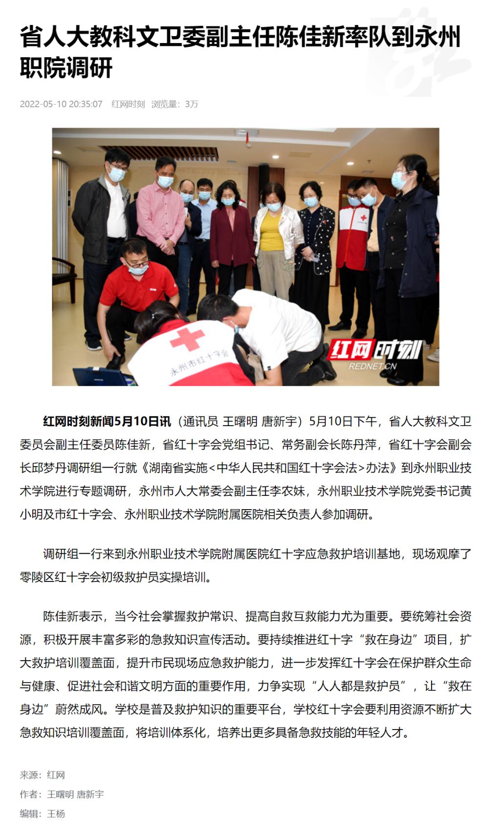 红网时刻新闻5月10日讯(通讯员 王曙明 唐新宇)5月10日下午,省人大教科文卫委员会副主任委员陈佳新,省红十字会党组书记、常务副会长陈丹萍,省红十字会副会长邱梦丹调研组一行就《湖南省实施<中华人民共和国红十字会法>办法》到永州职业技术学院进行专题调研,永州市人大常委会副主任李农妹,永州职业技术学院党委书记黄小明及市红十字会、永州职业技术学院附属医院相关负责人参加调研。