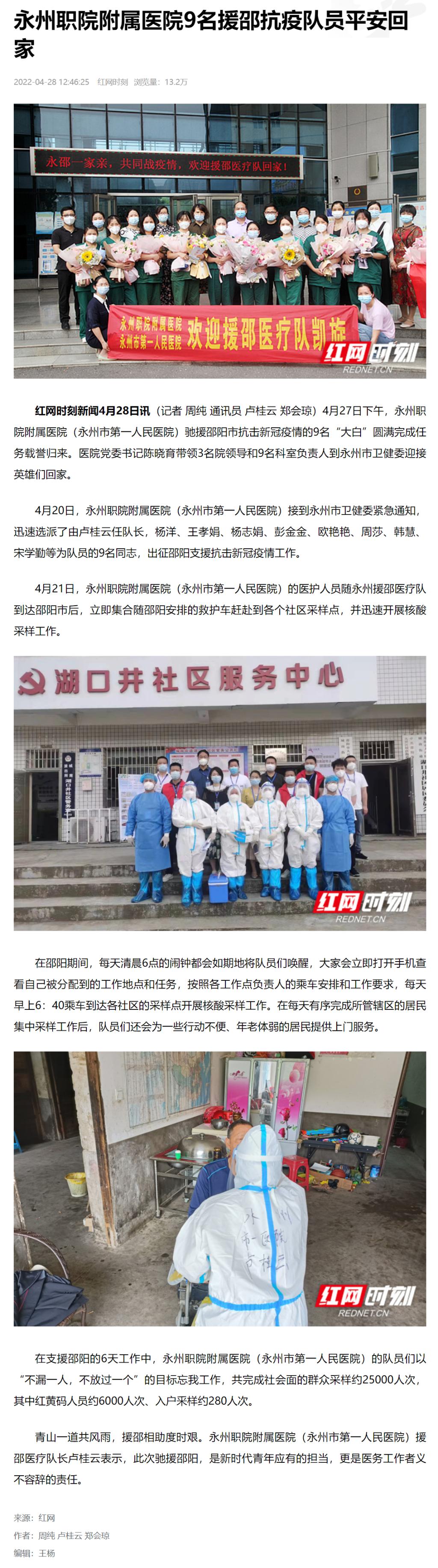 4月20日,永州职院附属医院(永州市第一人民医院)接到永州市卫健委紧急通知,迅速选派了由卢桂云任队长,杨洋、王孝娟、杨志娟、彭金金、欧艳艳、周莎、韩慧、宋学勤等为队员的9名同志,出征邵阳支援抗击新冠疫情工作。