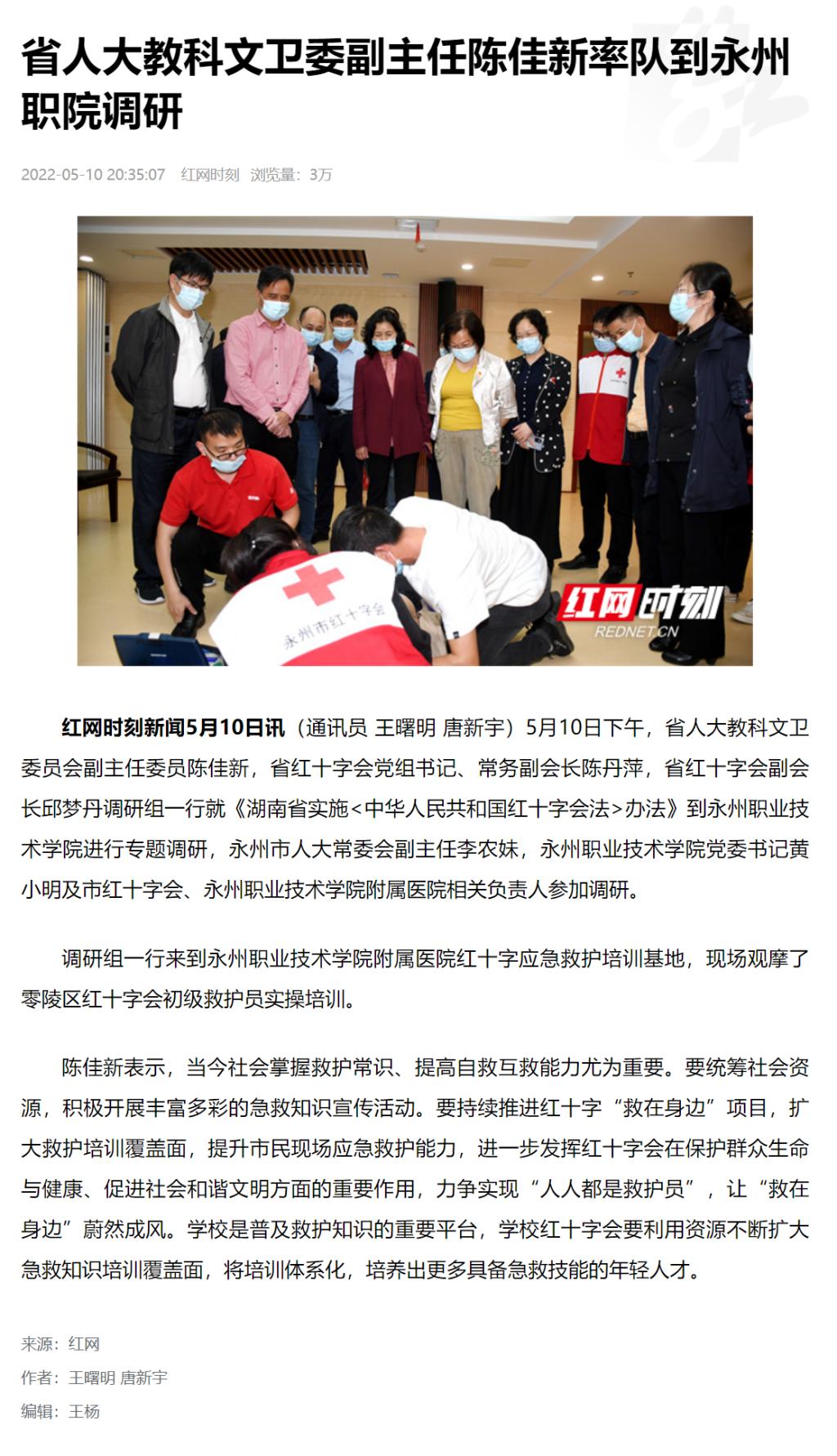 红网时刻新闻5月10日讯(通讯员 王曙明 唐新宇)5月10日下午,省人大教科文卫委员会副主任委员陈佳新,省红十字会党组书记、常务副会长陈丹萍,省红十字会副会长邱梦丹调研组一行就《湖南省实施<中华人民共和国红十字会法>办法》到永州职业技术学院进行专题调研,永州市人大常委会副主任李农妹,永州职业技术学院党委书记黄小明及市红十字会、永州职业技术学院附属医院相关负责人参加调研。