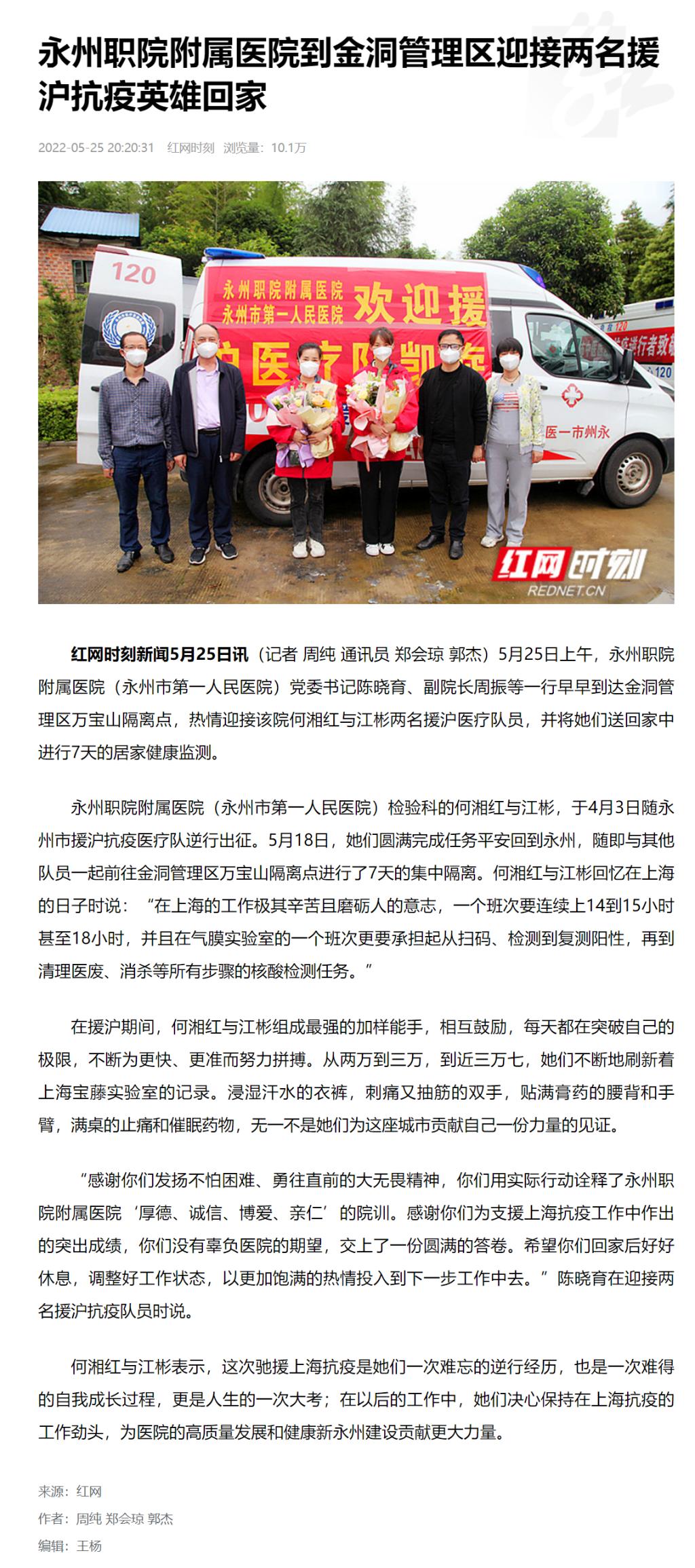 红网时刻新闻5月25日讯(记者 周纯 通讯员 郑会琼 郭杰)5月25日上午,永州职院附属医院(永州市第一人民医院)党委书记陈晓育、副院长周振等一行早早到达金洞管理区万宝山隔离点,热情迎接该院何湘红与江彬两名援沪医疗队员,并将她们送回家中进行7天的居家健康监测。