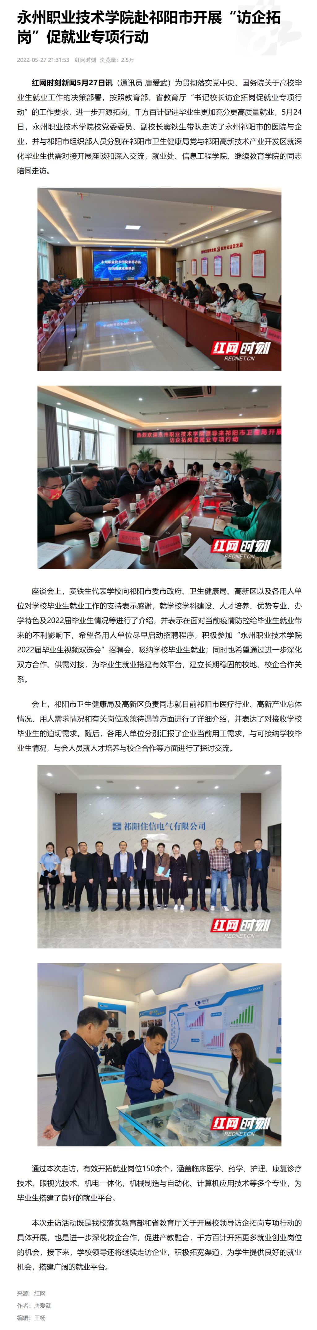 红网时刻新闻5月27日讯(通讯员 唐爱武)为贯彻落实党中央、国务院关于高校毕业生就业工作的决策部署,按照教育部、省教育厅“书记校长访企拓岗促就业专项行动”的工作要求,进一步开源拓岗,千方百计促进毕业生更加充分更高质量就业,5月24日,永州职业技术学院校党委委员、副校长窦铁生带队走访了永州祁阳市的医院与企业,并与祁阳市组织部人员分别在祁阳市卫生健康局党与祁阳高新技术产业开发区就深化毕业生供需对接开展座谈和深入交流,就业处、信息工程学院、继续教育学院的同志陪同走访。