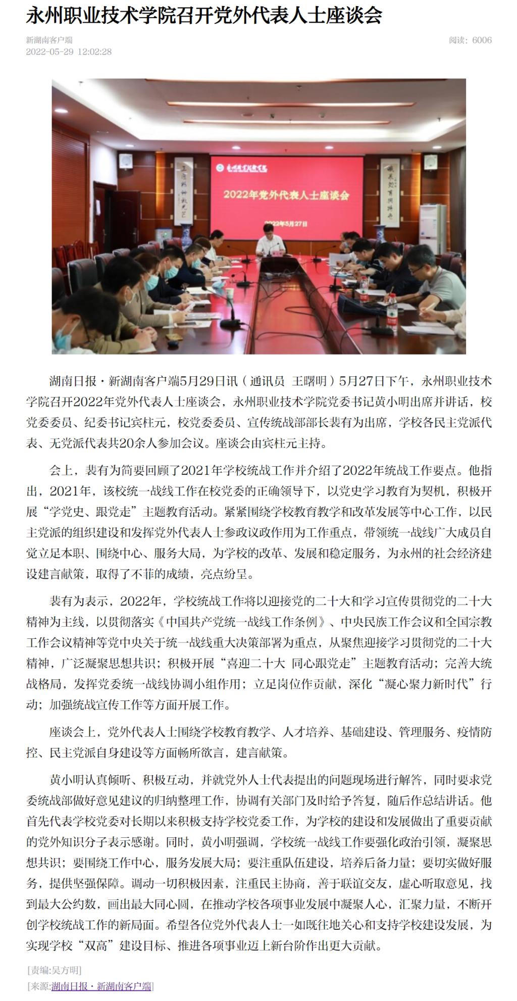 湖南日报·新湖南客户端5月29日讯(通讯员 王曙明)5月27日下午,永州职业技术学院召开2022年党外代表人士座谈会,永州职业技术学院党委书记黄小明出席并讲话,校党委委员、纪委书记宾柱元,校党委委员、宣传统战部部长裴有为出席,学校各民主党派代表、无党派代表共20余人参加会议。座谈会由宾柱元主持。