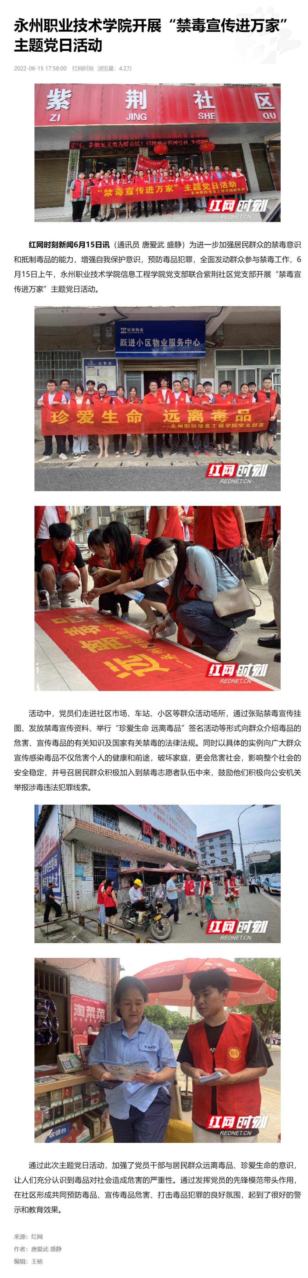 红网时刻新闻6月15日讯(通讯员 唐爱武 盛静)为进一步加强居民群众的禁毒意识和抵制毒品的能力,增强自我保护意识,预防毒品犯罪,全面发动群众参与禁毒工作,6月15日上午,永州职业技术学院信息工程学院党支部联合紫荆社区党支部开展“禁毒宣传进万家”主题党日活动。