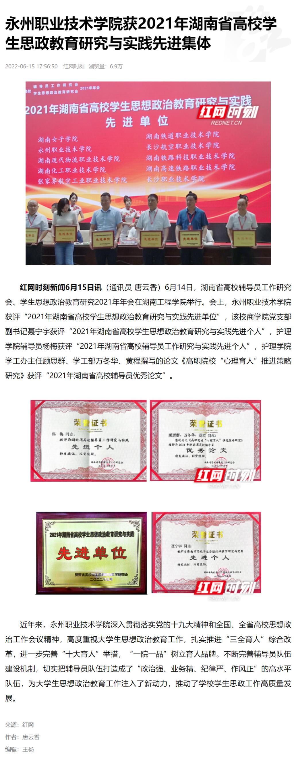红网时刻新闻6月15日讯(通讯员 唐云香)6月14日,湖南省高校辅导员工作研究会、学生思想政治教育研究2021年年会在湖南工程学院举行。会上,永州职业技术学院获评“2021年湖南省高校学生思想政治教育研究与实践先进单位”,该校商学院党支部副书记聂宁宇获评“2021年湖南省高校学生思想政治教育研究与实践先进个人”,护理学院辅导员杨梅获评“2021年湖南省高校辅导员工作研究与实践先进个人”,护理学院学工办主任顾思群、学工部万冬华、黄程撰写的论文《高职院校“心理育人”推进策略研究》获评“2021年湖南省高校辅导员优秀论文”。