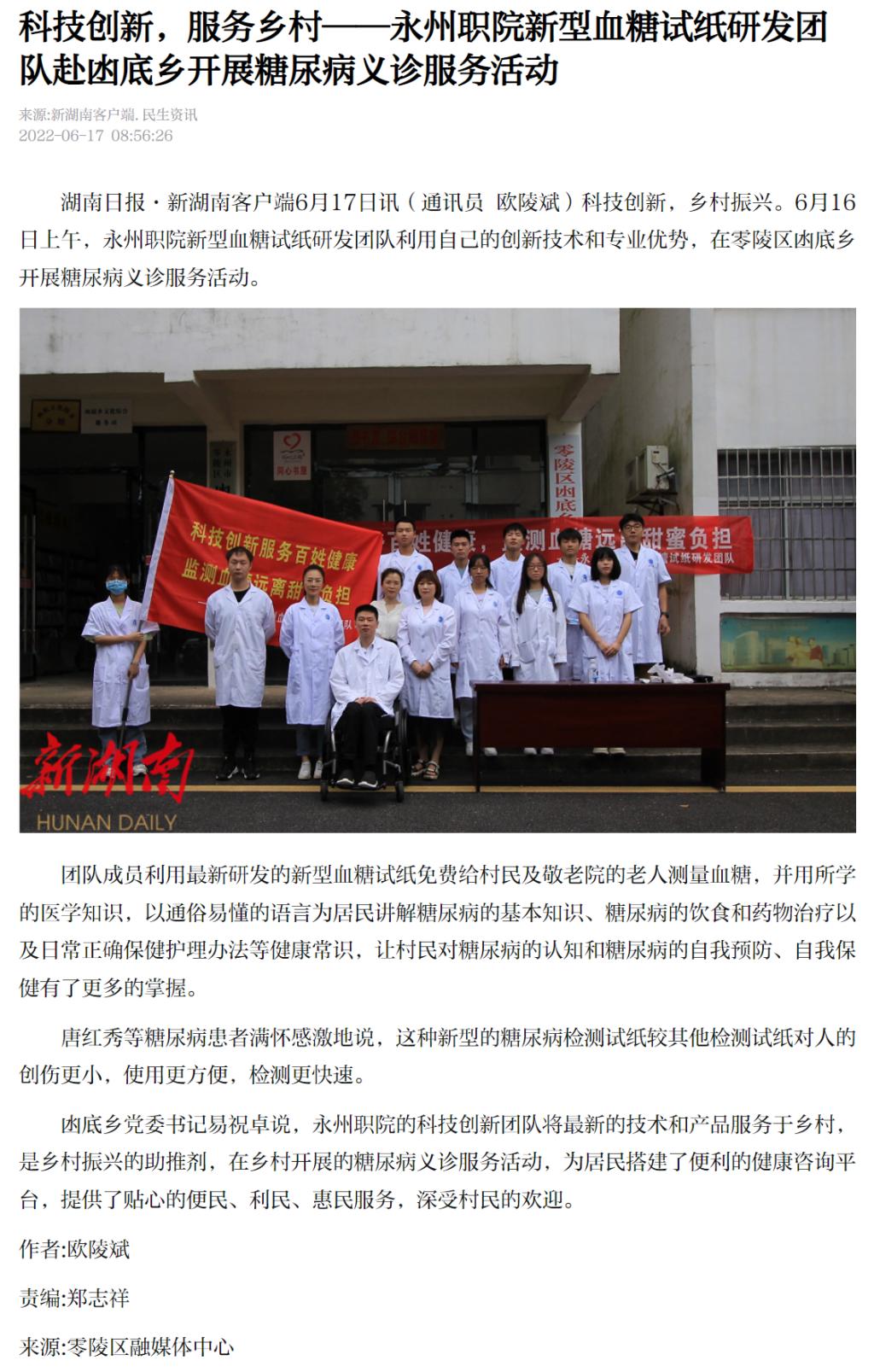 湖南日报·新湖南客户端6月17日讯(通讯员欧陵斌)科技创新,乡村振兴。6月16日上午,永州职院新型血糖试纸研发团队利用自己的创新技术和专业优势,在零陵区凼底乡开展糖尿病义诊服务活动。