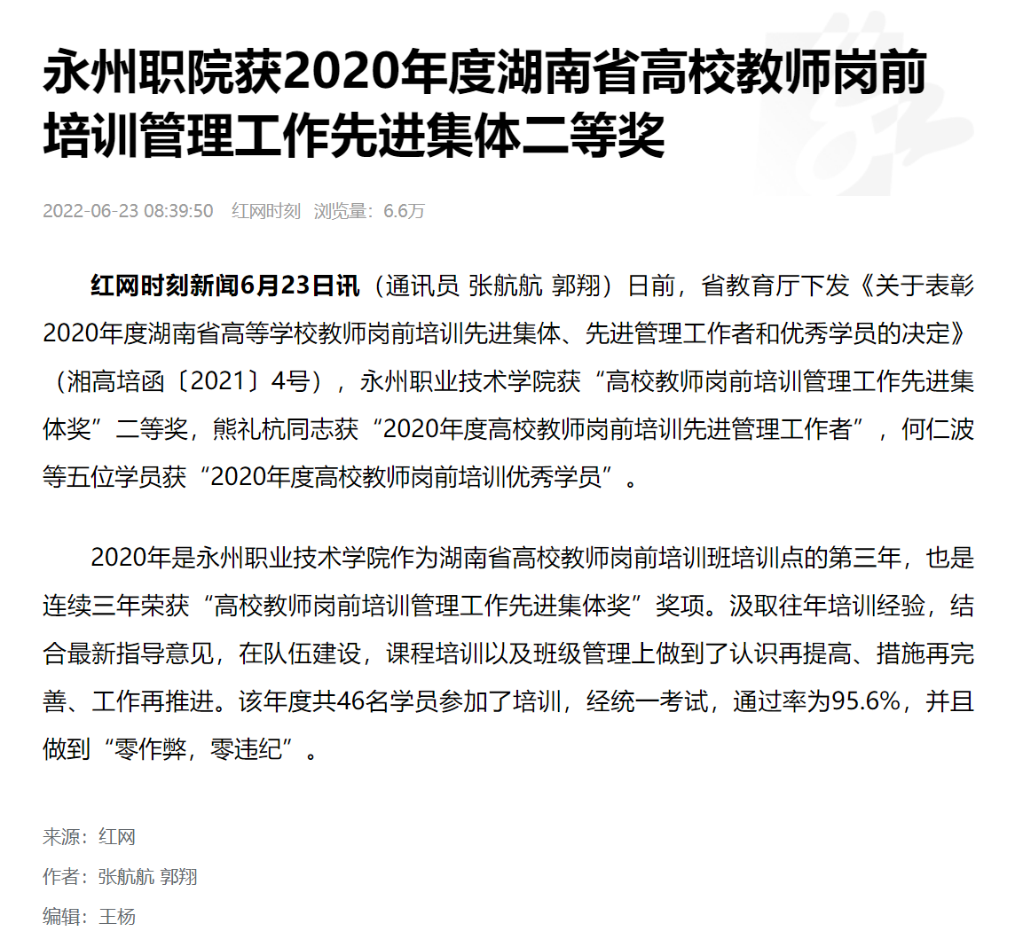 红网时刻新闻6月23日讯(通讯员 张航航 郭翔)日前,省教育厅下发《关于表彰2020年度湖南省高等学校教师岗前培训先进集体、先进管理工作者和优秀学员的决定》(湘高培函〔2021〕4号),永州职业技术学院获“高校教师岗前培训管理工作先进集体奖”二等奖,熊礼杭同志获“2020年度高校教师岗前培训先进管理工作者”,何仁波等五位学员获“2020年度高校教师岗前培训优秀学员”。
