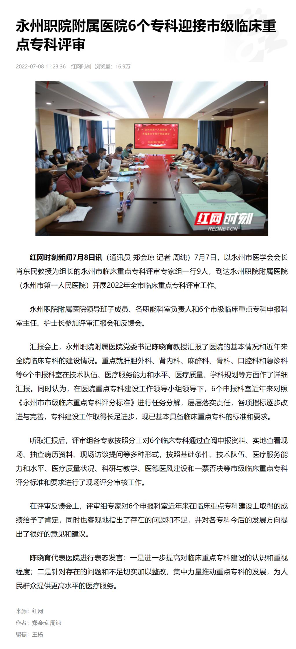 红网时刻新闻7月8日讯(通讯员 郑会琼 记者 周纯)7月7日,以永州市医学会会长肖东民教授为组长的永州市临床重点专科评审专家组一行9人,到达永州职院附属医院(永州市第一人民医院)开展2022年全市临床重点专科评审工作。