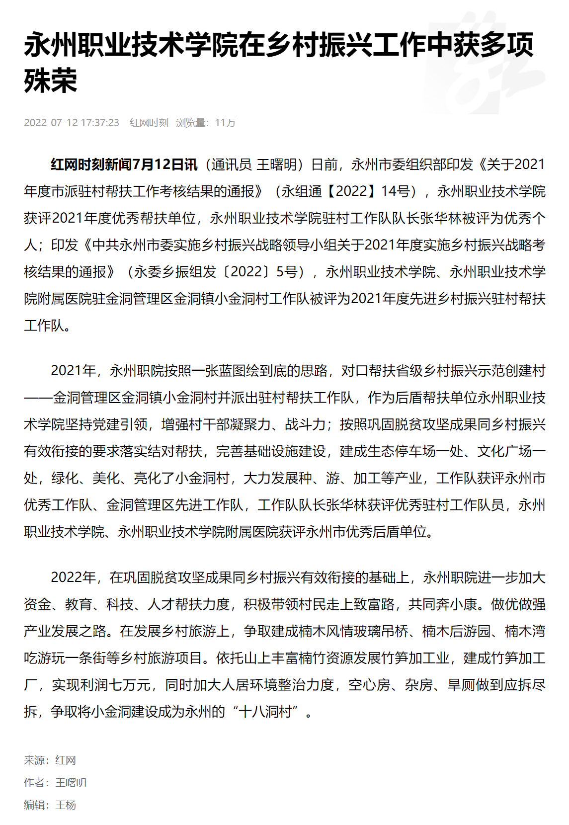 红网时刻新闻7月12日讯(通讯员 王曙明)日前,永州市委组织部印发《关于2021年度市派驻村帮扶工作考核结果的通报》(永组通【2022】14号),永州职业技术学院获评2021年度优秀帮扶单位,永州职业技术学院驻村工作队队长张华林被评为优秀个人;印发《中共永州市委实施乡村振兴战略领导小组关于2021年度实施乡村振兴战略考核结果的通报》(永委乡振组发〔2022〕5号),永州职业技术学院、永州职业技术学院附属医院驻金洞管理区金洞镇小金洞村工作队被评为2021年度先进乡村振兴驻村帮扶工作队。