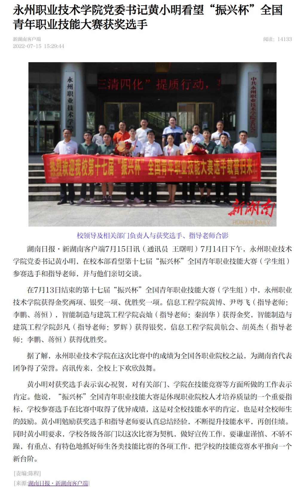 据了解,永州职业技术学院在这次比赛中的成绩为全国各职业院校之最,为湖南省代表团争得了荣誉。喜讯传来,全校上下欢欣鼓舞。