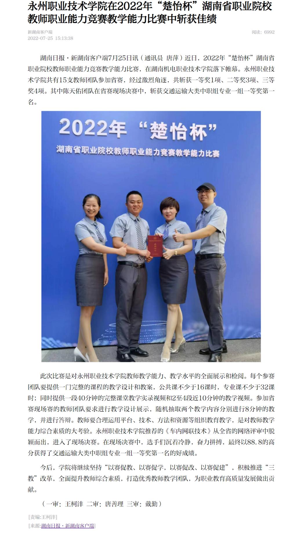 湖南日报·新湖南客户端7月25日讯(通讯员 唐萍)近日,2022年“楚怡杯”湖南省职业院校教师职业能力竞赛教学能力比赛,在湖南机电职业技术学院落下帷幕。永州职业技术学院共有15支教师团队参加省赛,经过激烈角逐,共斩获一等奖1项、二等奖3项、三等奖4项。其中陈天佑团队在省赛现场决赛中,斩获交通运输大类中职组专业一组一等奖第一名。