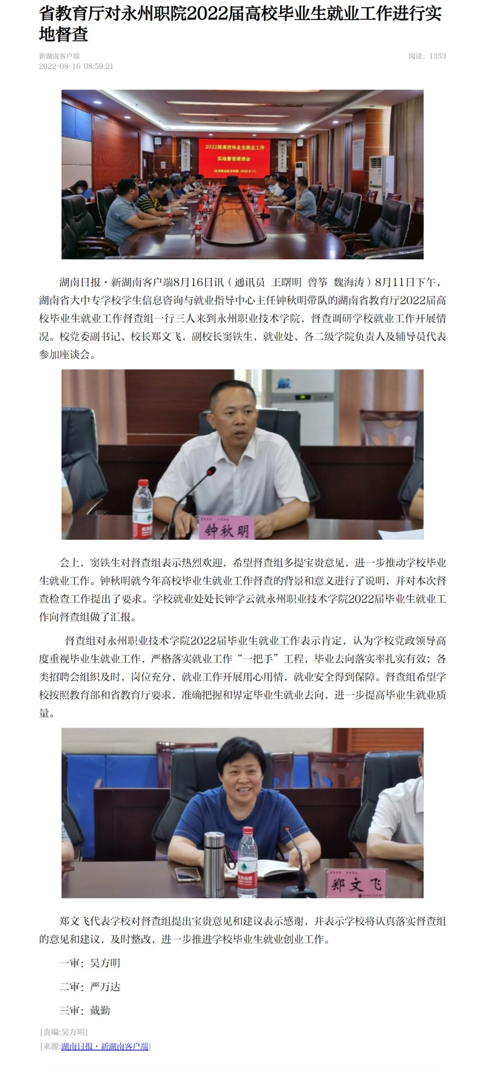 湖南日报·新湖南客户端8月16日讯(通讯员 王曙明 曾筝 魏海涛)8月11日下午,湖南省大中专学校学生信息咨询与就业指导中心主任钟秋明带队的湖南省教育厅2022届高校毕业生就业工作督查组一行三人来到永州职业技术学院,督查调研学校就业工作开展情况。校党委副书记、校长郑文飞,副校长窦铁生,就业处、各二级学院负责人及辅导员代表参加座谈会。